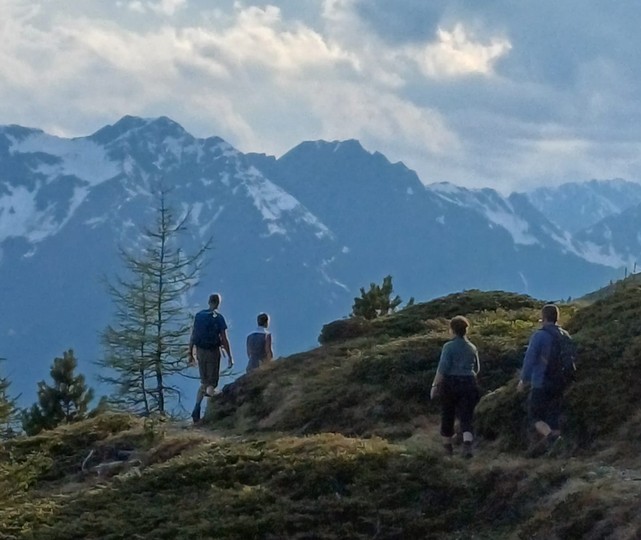Eine Sonnenuntergangswanderung mit Abendessen auf der Alm.