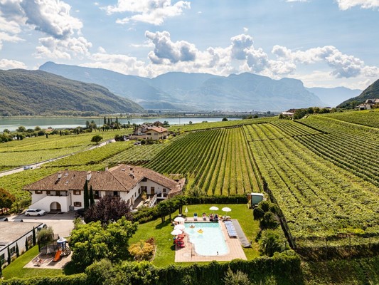 Genießen Sie die wunderbare Landschaft am wärmsten Badesee der Alpen. Das Hotel Garni am Kalterer See (nur 5 Gehminuten) liegt in sonniger Lage mitten in der Reblandschaft an der Südtiroler Weinstraße.