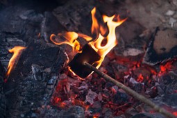 Die Schneekristalle funkeln im Licht der Fackeln.
