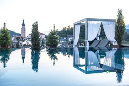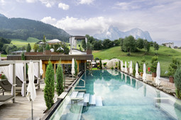 Ein Platz zum Erholen und Ausspannen ist die Dachterrasse mit Panorama- Sky Pool mit integrierter Whirlpool-Lounge, Sonnenliegen, Relaxbetten für Pärchen, Panorama-Sauna inklusive herrlicher Aussicht auf Kastelruth, Berge, Wiesen und Wälder.
