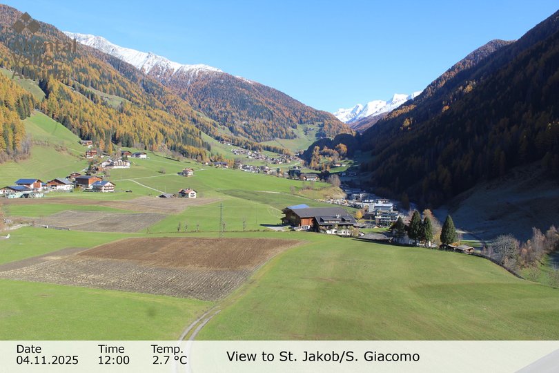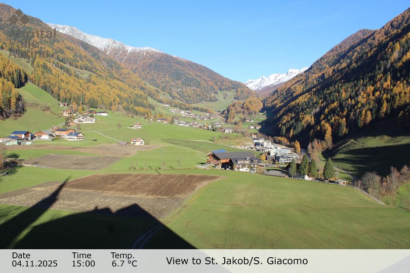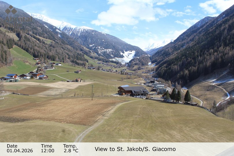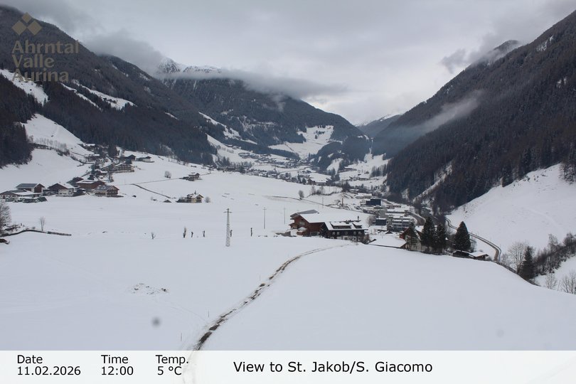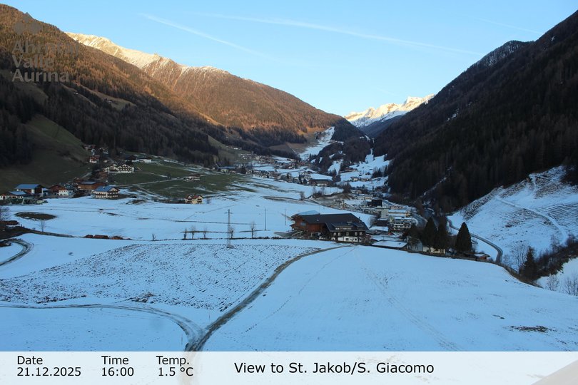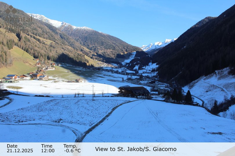 Die Webcam befindet sich auf dem Dach des Hotels Bühelwirt in St. Jakob im Ahrntal und zeigt in Richtung Nordost. In der Mitte des Bildes: die Ortschaft St. Peter. Zwischen den Bergen im Hintergrund sind die Gipfel Dreiherrenspitze und Merbspitze zu sehen, während im Vordergrund die Ahr fließt. Diese Webcam ist der ideale Observationspunkt, um die Wetterlage im Ahrntal zu beobachten – nur drei Kilometer entfernt von den Liften im Skigebiet Klausberg.