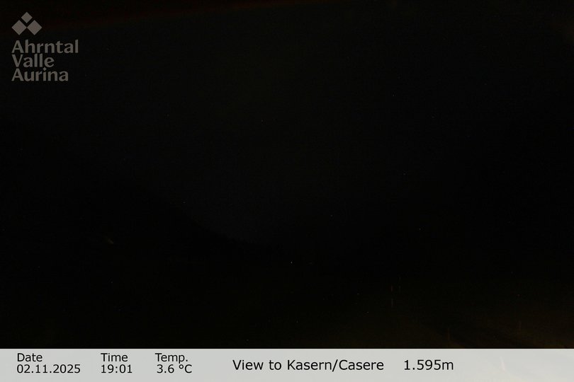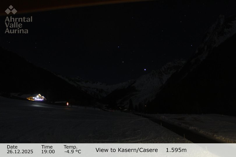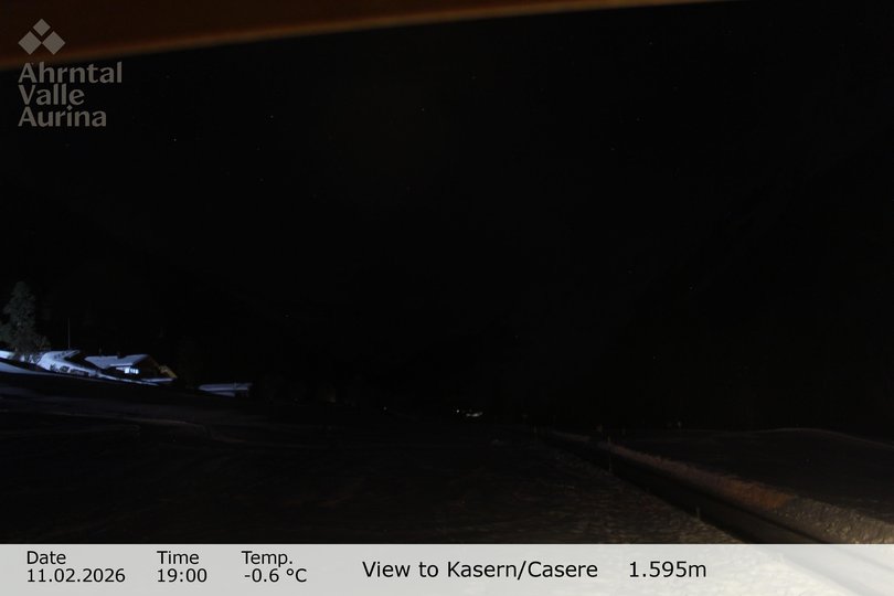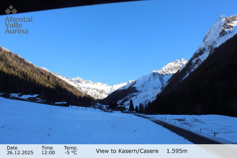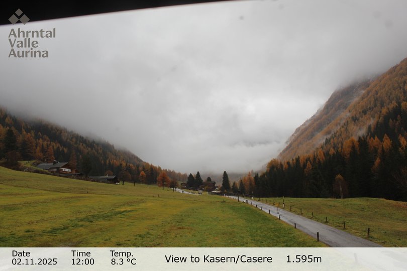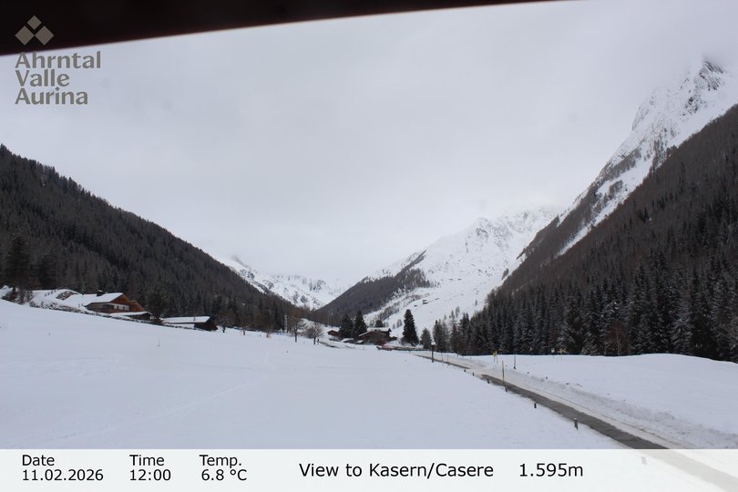 Blick in Richtung Talschluss des Ahrntals mit der Heilig-Geist-Kirche, die nördlichste Kirche Italiens. Im Winter kann man dank dieser Webcam den schneebedeckten Snowpark Kasern mit Rodel- und Reifenbahn und die Sonnenloipe Kasern sehen. Im Sommer beherrschen die grünen Wiesen und Wälder des Ahrntals die Landschaft.