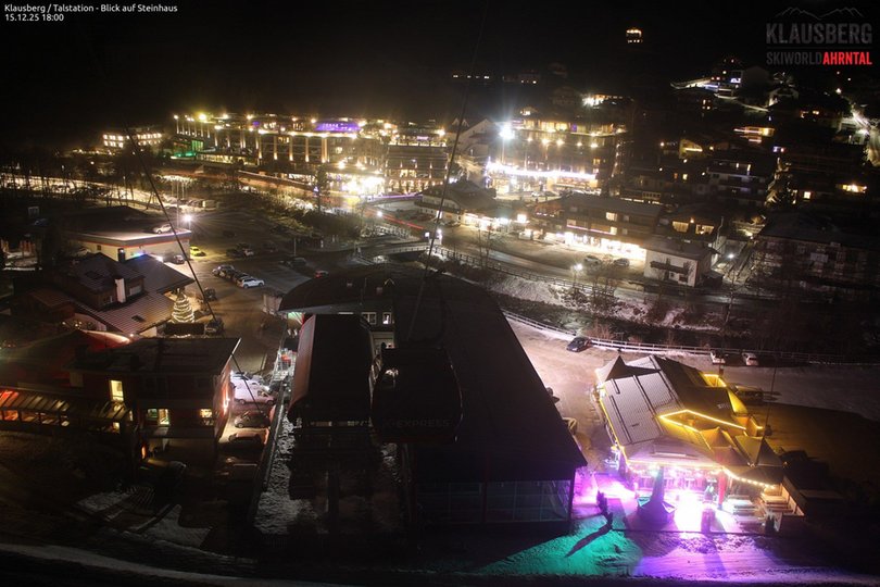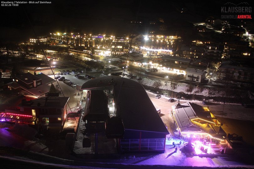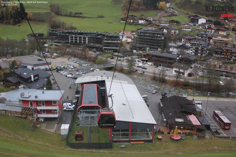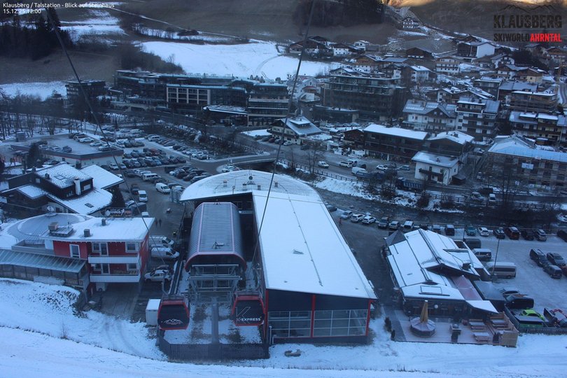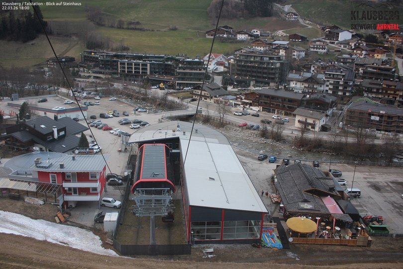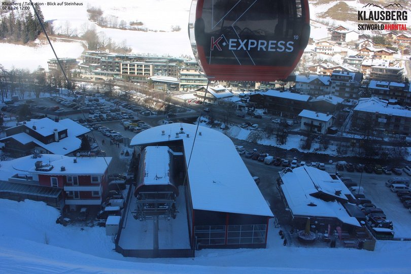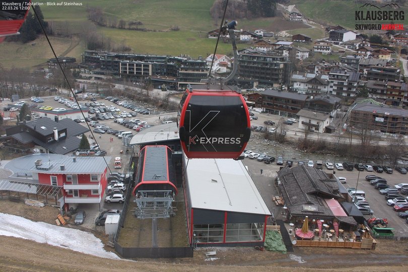 Blick von oben auf die Talstation der Kabinenbahn K-Express im Skigebiet Klausberg. Die Skiworld Ahrntal im Ahrntal bestet aus den beiden Skigebieten Klausberg und Speikboden und bietet 76km Pisten mit insgesamt 21 Aufstiegsanlagen. Diese Webcam zeigt einen Teil des Dorfes Steinhaus mit seinem Fluss Ahr und ist ideal, um die Wetter- und Schneebedingungen in diesem Teil des Ahrntals zu entdecken.