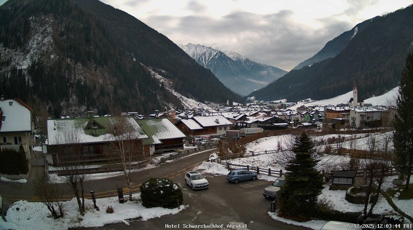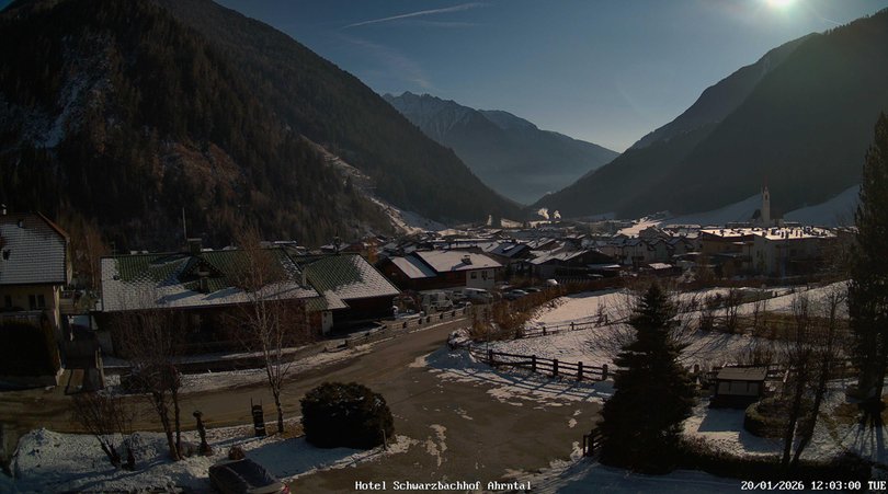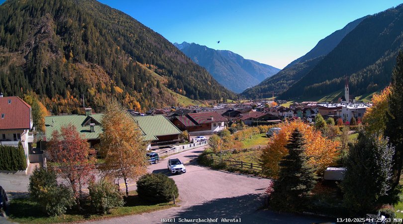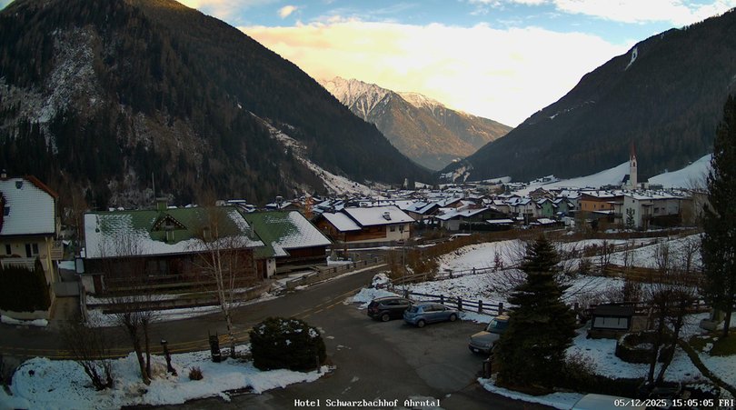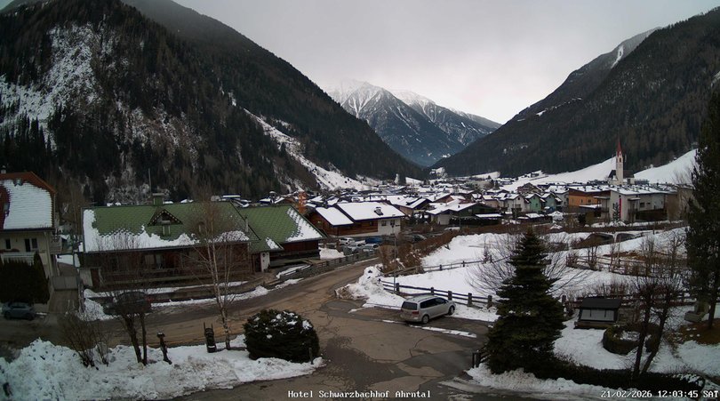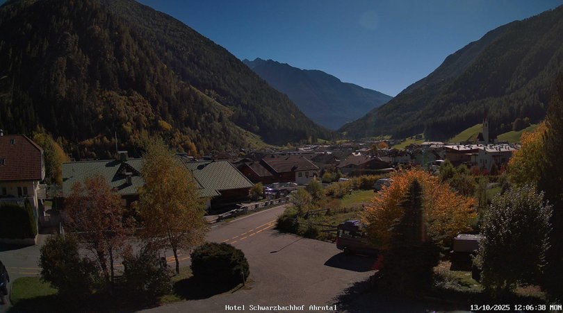 Panoramablick auf Luttach, rechts erkennt man den Kirchturm der Pfarrkirche zum Hl. Sebastian und im Hintergrund die große und die kleine Windschar. Dank dieser Webcam, installiert auf dem Dach des Hotels Schwarzbachhof, können Sie die Wetterbedingungen in Luttach immer im Auge behalten.