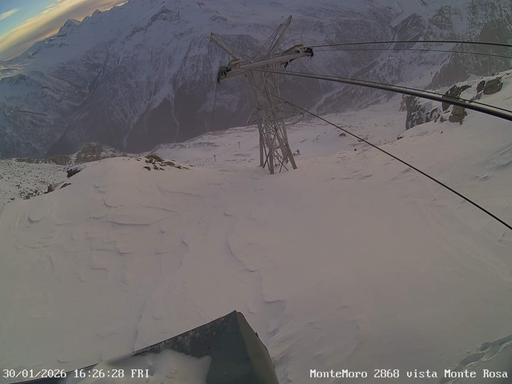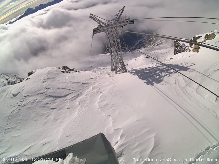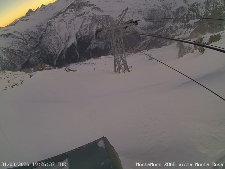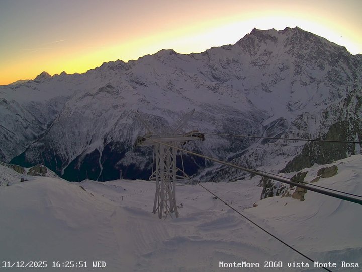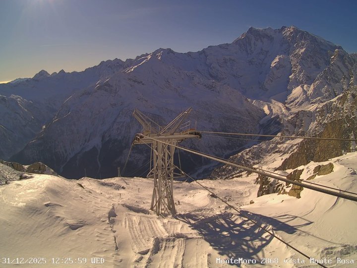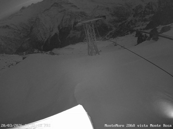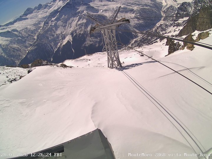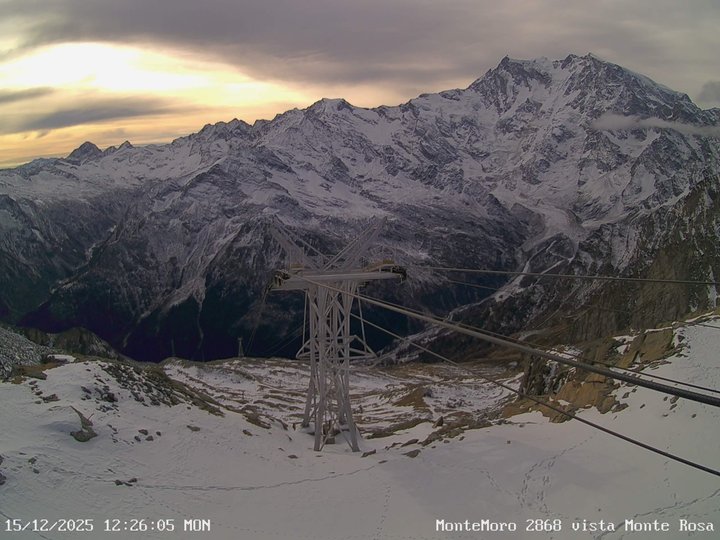 Durch diese Webcam kann man die Monte-Rosa-Ostwand in all ihrer Schönheit und mit dem beeindruckenden Gletscher, der den Gipfel verziert, bewundern. Die Webcam ist auf dem Monte Moro positioniert, wenig unterhalb der Berghütte Oberto Maroli und des Höhenrestaurants Lago Smeraldo. Auf den Bildern, die die Webcam überträgt, sind sowohl die Masten der Seilbahn zu sehen, die von Macugnaga aus bergauf geht, sowie auch Teile der schwarzen Piste Roccette Bis.