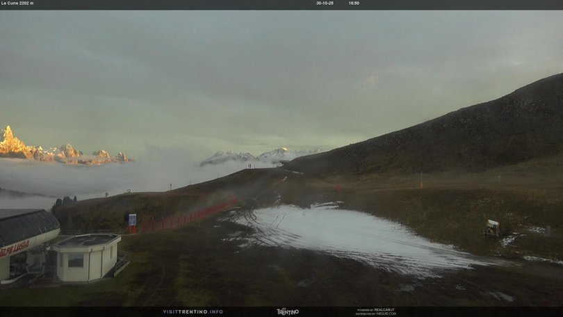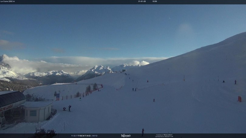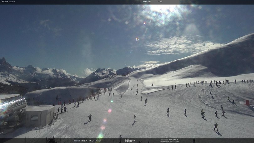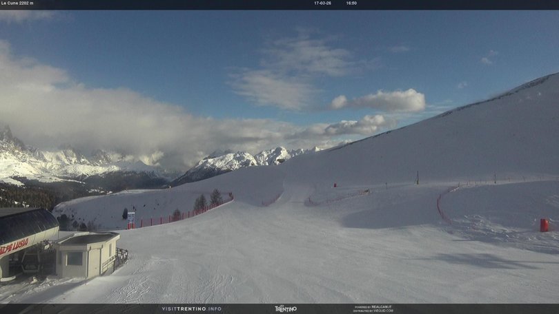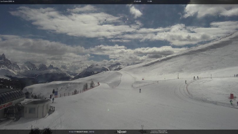 Die Webcam bietet eine wunderschöne Aussicht auf den Berg Cima Lastè, die Palagruppe und die Lagorai-Bergkette. Im Vordergrund die Bergstation der Seilbahn Valbona-Le Cune. Im Hintergrund, rechts, die Bergstation der Seilbahn Campo-Le Cune. Die Webcam ist ein optimaler Beobachtungspunkt, um in Echtzeit die Wetter- und Schneebedingungen im Skigebiet Alpe Lusia, am Fuße der Trentiner Dolomiten, zu entdecken.