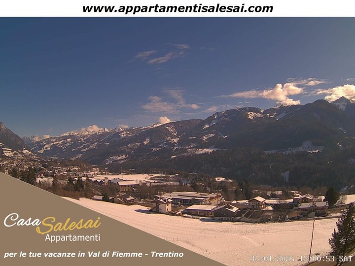 Die Webcam ist auf dem Dach der Ferienwohnungen Casa Salesai, im Teilort Carano der Stadt Ville di Fiemme, installiert. Sie bietet einen Panoramablick über das Fleimstal mit den Gemeinden Cavalese und, weiter links, Tesero. Im Hintergrund die Palagruppe, die größte Berggruppe der Dolomiten. Im Vordergrund die Lagorai-Bergkette, rechts die Alpe Cermis, das Ski- und Wandergebiet Cavalese. Mit dieser Webcam können Sie zu jeder Zeit die Wetter- und Schneebedingungen im Fleimstal im Trentino beobachten.
