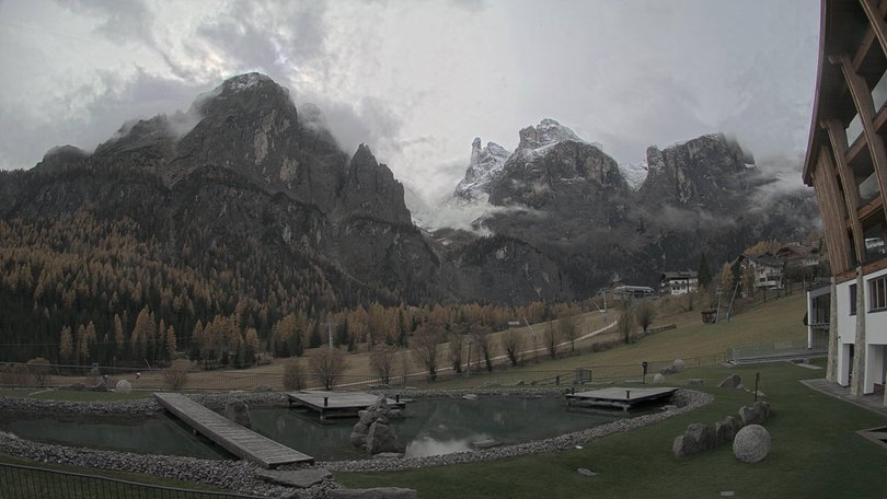 Blick auf den Teich des Romantik Hotel Cappella in Colfosco. Im Hintergrund das Mittagstal, die Sellagruppe und der Pisciadù Klettersteig, im Sommer der meistbegangene Klettersteig der Dolomiten. Im Winter können Sie mit dieser Webcam erkennen, wann die Dolomiten von Schnee bedeckt werden und die “Vier Pässe-Tour” um den Sella eine der beliebtesten Ski-Strecken wird.