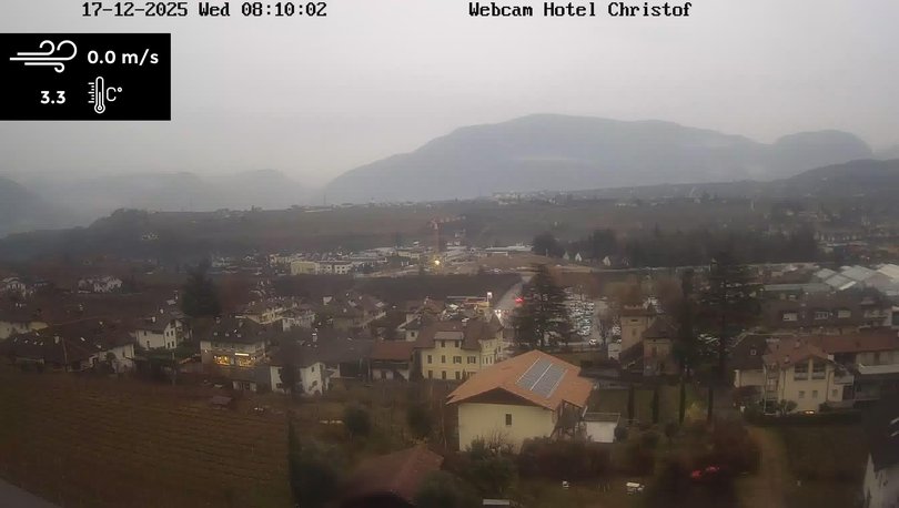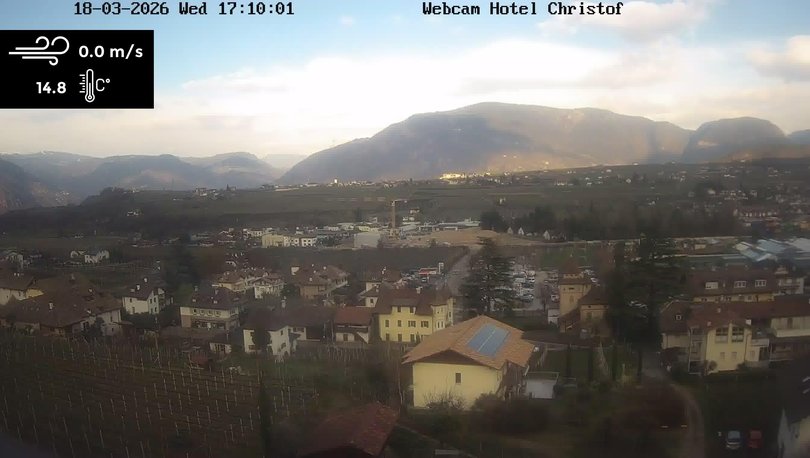 Panoramablick auf die Gemeinde Eppan an der Weinstraße, im Südwesten von Bozen. Diese Webcam, installiert auf dem Hotel Christof, zeigt die Fraktion St. Michael im unteren Teil des Bildes und die Fraktion Girlan auf dem Hügel im Hintergrund. In der Ferne kann man auch den Schlern erkennen. Sehen Sie sich diese Webcam an, um die Wetterbedingungen in diesem Gebiet in der Nähe von Bozen zu kontrollieren.