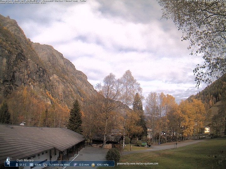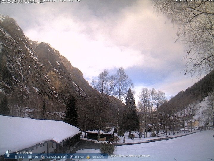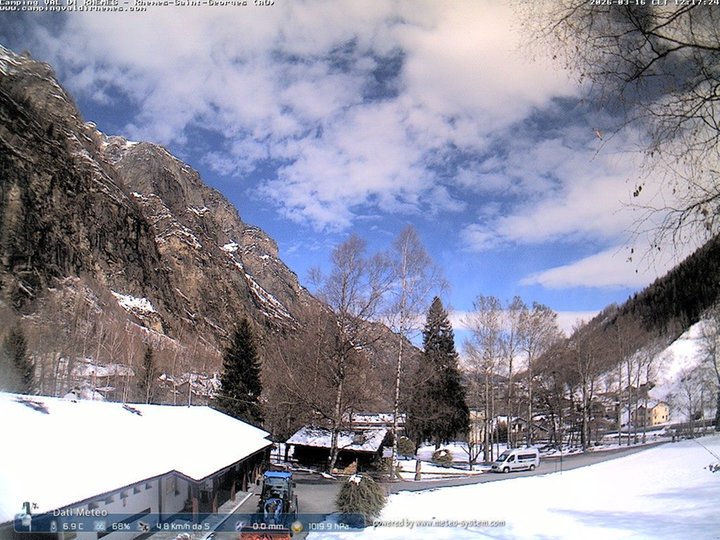 Diese Webcam ist Teil der Wetterstation des Campingplatzes Val di Rhêmes. Abgesehen von den Bildern, liefert sie auch Informationen zu Temperatur, Luftfeuchtigkeit, Wind, Regen und Luftdruck. Die Webcam ist nach Norden ausgerichtet und erlaubt einen Blick auf Teile des Tals von Rhêmes. Im Winter sind hinter den Bäumen die Häuser des Dorfes Rhêmes-Saint-Georges, umgeben von wunderschöner Natur, zu sehen. Die Kommune wird vom Fluss Dora di Rhêmes durchquert, der auf seiner orographisch rechten Seite Teil des Nationalparks Gran Paradiso ist.