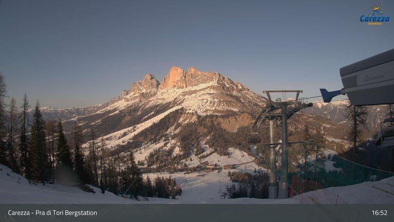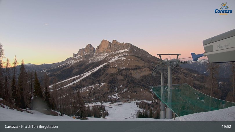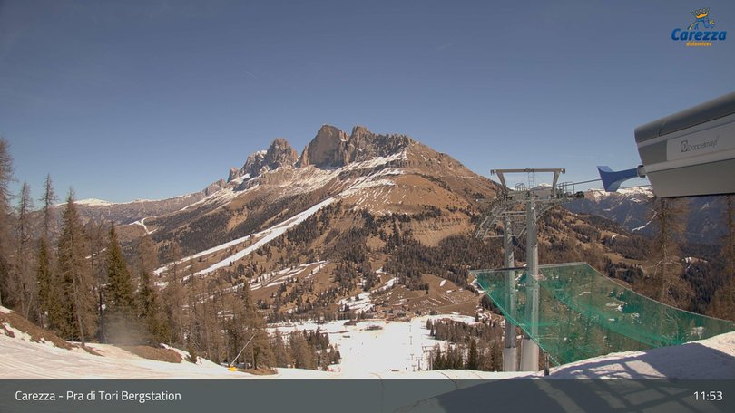 Panoramablick von der Bergstation des Sessellifts Pra Tori. Im Zentrum des Bildes kann man den Karerpass erkennen, der das Fassatal auf der rechten Seite und das Eggental auf der linken Seite verbindet. Im Hintergrund erhebt sich die Rosengartengruppe bis zu den 3.002m des Kesselkogels. Bei gutem Wetter hat man über diese Webcam einen wundervollen Blick, der es erlaubt die Schneebedingungen in diesem Gebiet zwischen Fassa- und Eggental, in der Nähe des Karersees, zu beobachten.