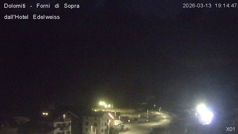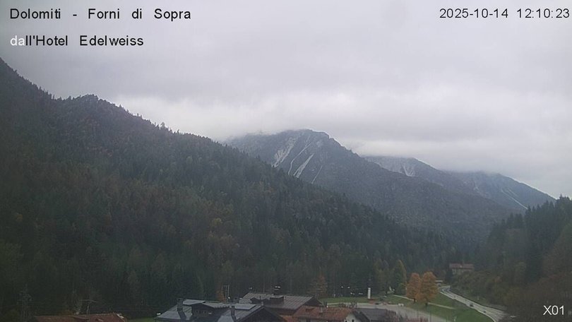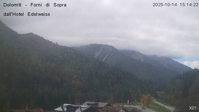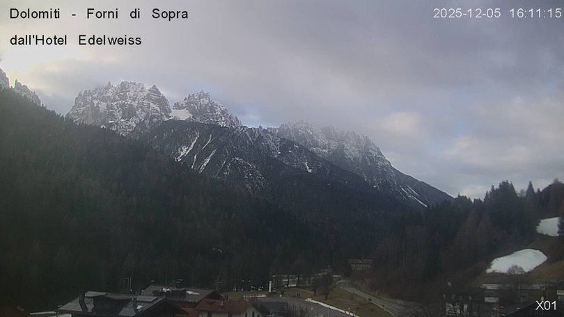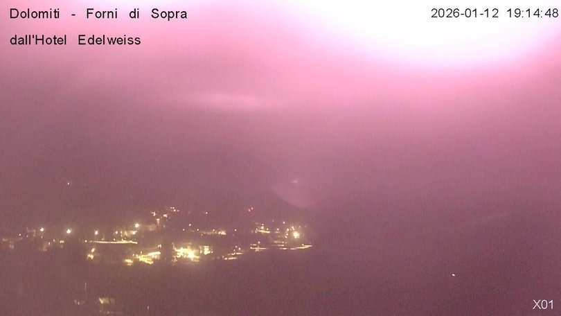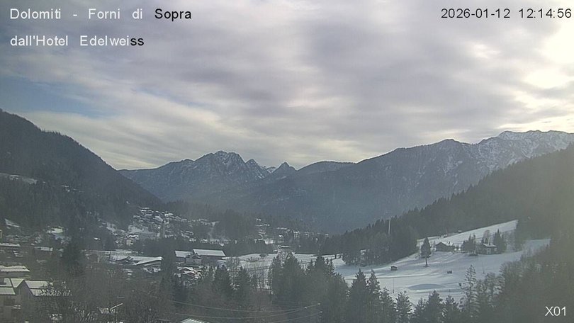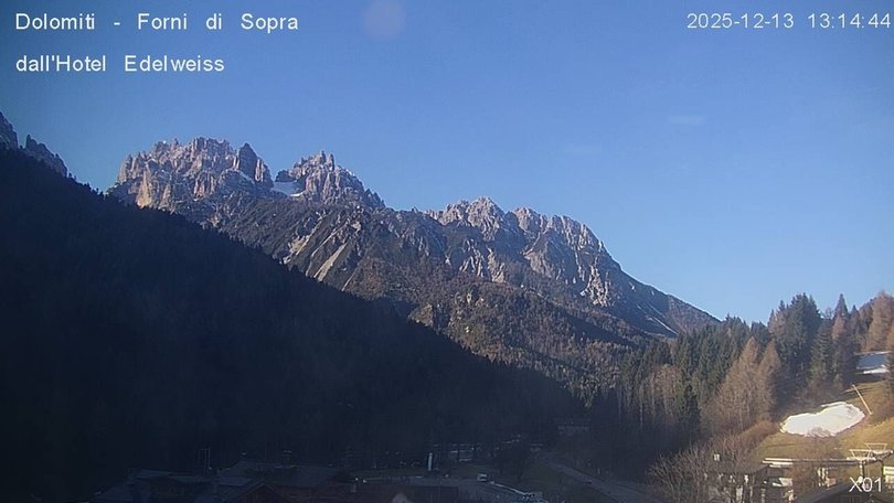 Panoramablick auf die Friauler Dolomiten vom Hotel Edelweiss in Forni di Sopra. Über diese Webcam sieht man den Gruppo del Cridola mit der Scodavacca-Scharte. Ein idealer Beobachtungspunkt, um die Wetterbedingungen des Gebiets und die winterlichen Schneefälle zu kontrollieren, die die Skipisten in weiß kleiden.