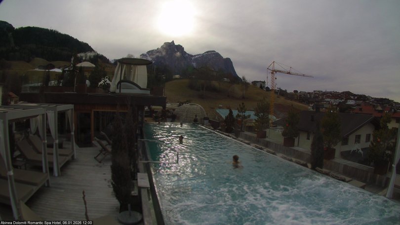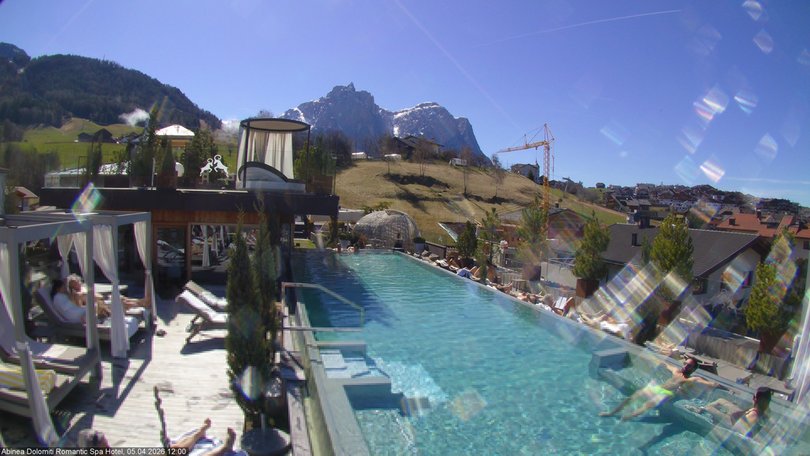 Der atemberaubende Ausblick vom Sky Pool im letzten Stock des ABINEA Dolomiti Romantic SPA Hotel. Das Panorama reicht von Kastelruth und Umgebung bis hin zur Schlerngruppe mit Schlern und Santner. Diese Webcam, installiert auf der Dachterrasse des Hotels, ist ein optimaler Bezugspunkt, um die Wetter- und Schneebedigungen in Kastelruth zu überprüfen.