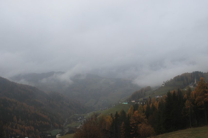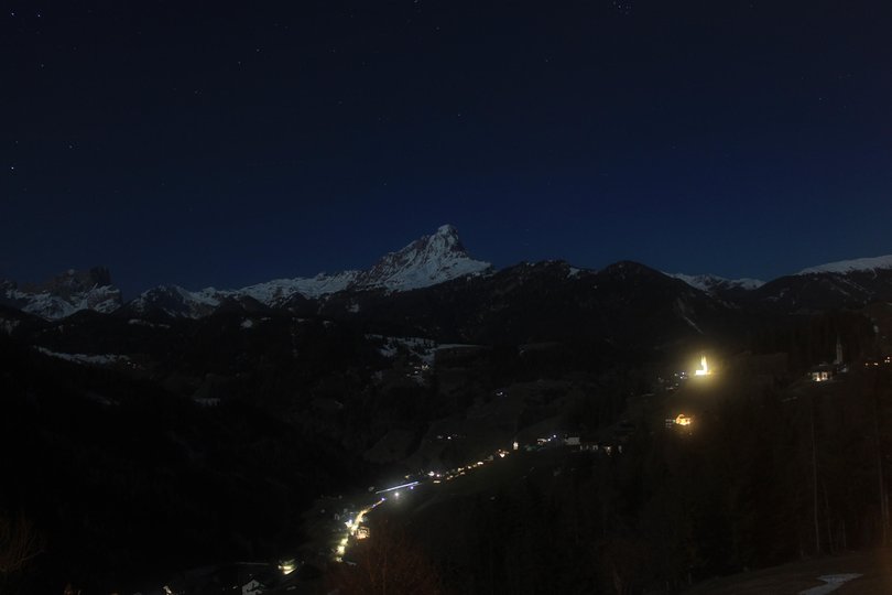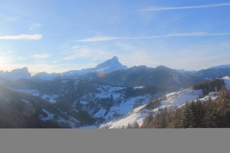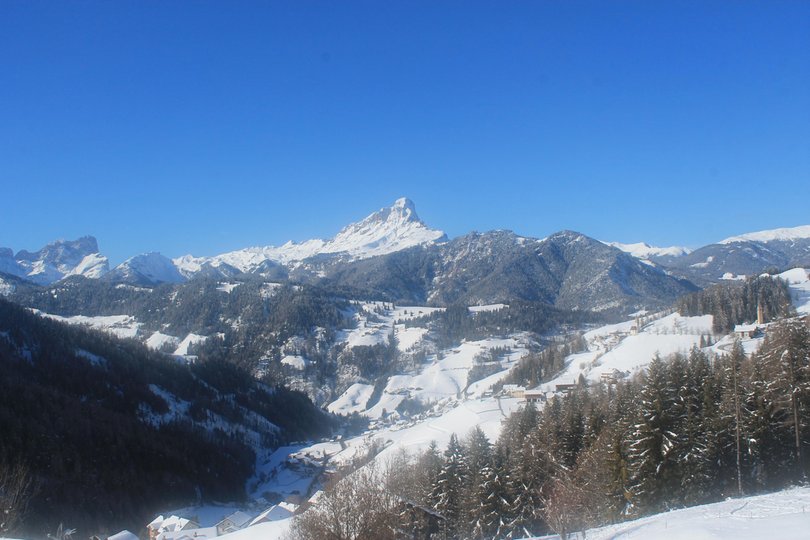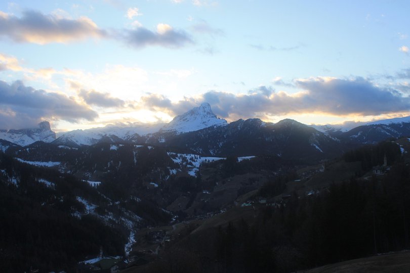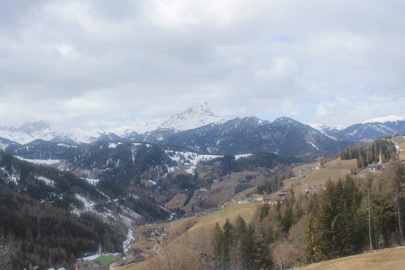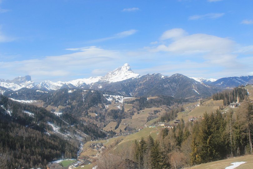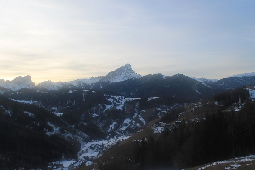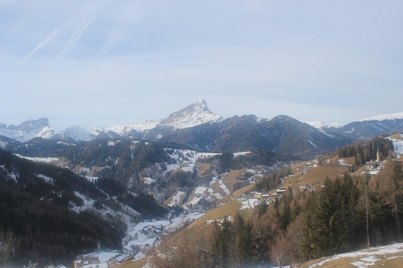 Panorama vom Hotel Ciurnadú, im Dorf Wengen im Gadertal, Richtung Peitlerkofel. Von hier oben ist der Blick immer magisch, sowohl im Winter als auch im Sommer.