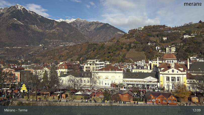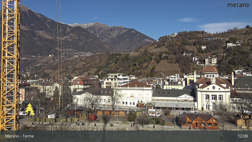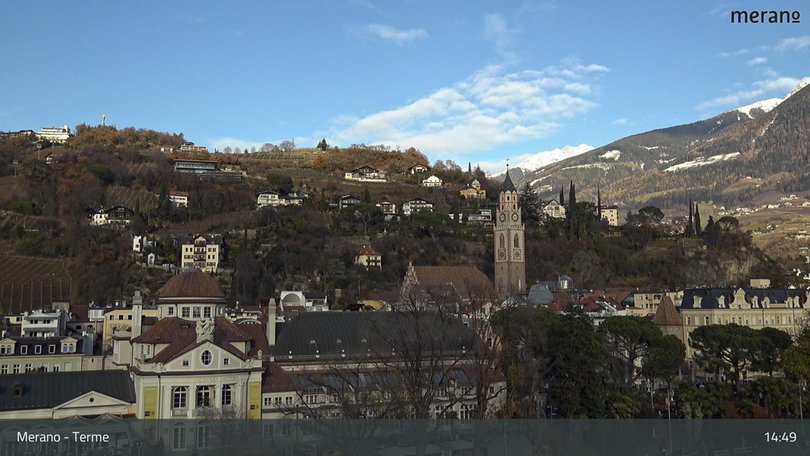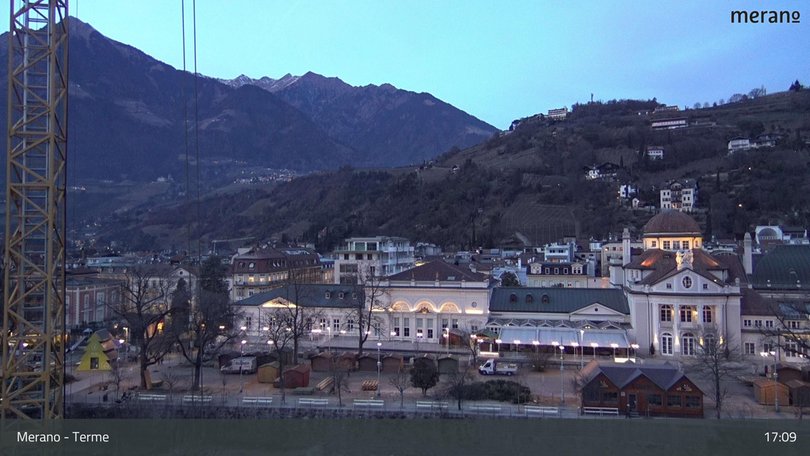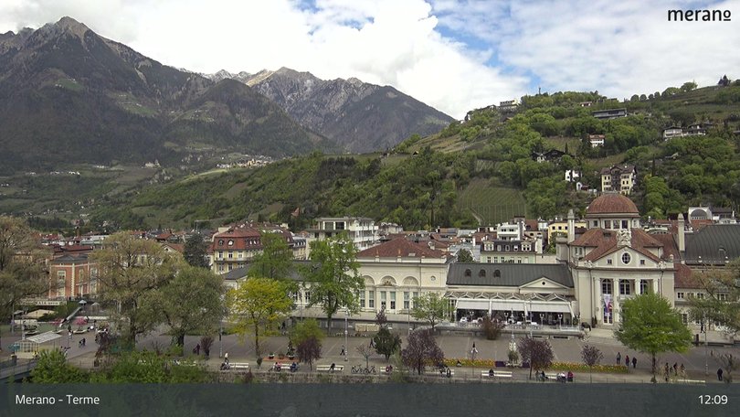 Die Webcam bietet einen Blick auf die Stadt Meran von der Terrasse des Hotels Terme Merano aus. Von diesem privilegierten Aussichtspunkt aus kann man das Jugendstilgebäude Kurhaus von Meran sehen, in dem zahlreiche Veranstaltungen stattfinden, darunter das bekannte Merano WineFestival. Neben der Promenade entlang des Flusses Passer, der in die Etsch mündet, prägen auch der Kirchturm des Doms und der Pulverturm das Panorama. Meran liegt im Talboden am Beginn des Vinschgaus, des Passeiertals und des Etschtals, am Fuße der Texelgruppe, die im Hintergrund des Bildes zu sehen ist. Dank des milden Klimas kann Meran auf eine lange touristische Tradition zurückblicken – selbst Kaiserin Elisabeth von Österreich, genannt Sissi, hielt sich hier auf. Die Stadt ist von Wanderwegen umgeben, einige davon sehr bekannt, wie der Tappeinerweg, der Marlinger Waalweg sowie der Meraner Höhenweg. Der Naturpark Texelgruppe liegt direkt vor den Toren der Stadt und ist ebenfalls ein beliebtes Ziel für Wanderer. Diese Bilder sind ideal, um jederzeit das aktuelle Wetter in Meran, einer Stadt in Südtirol, zu sehen.