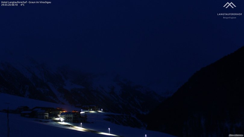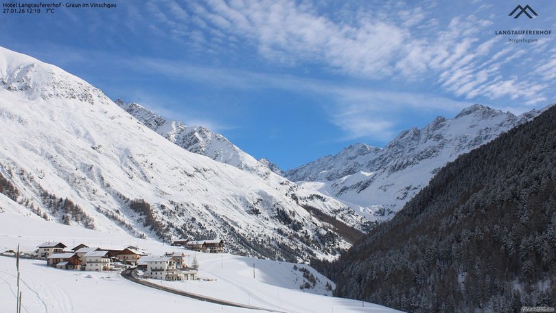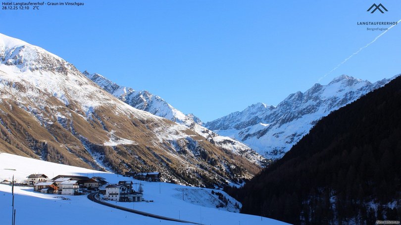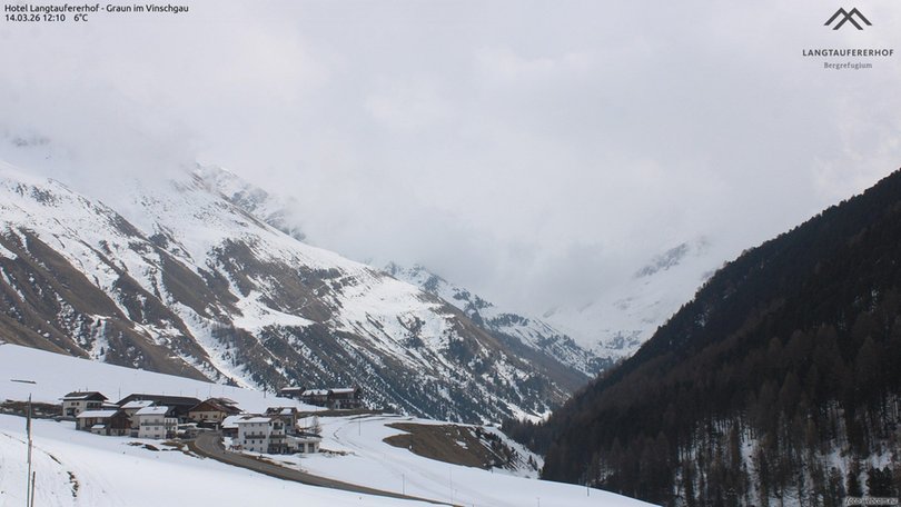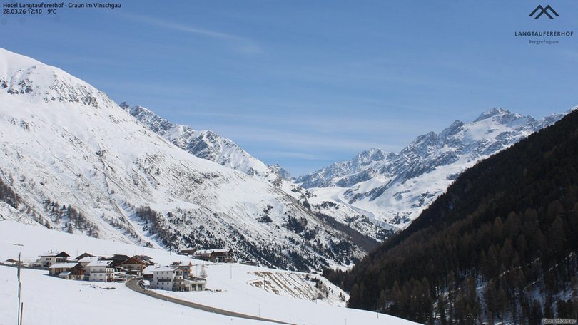 Panoramablick von Kappl, Graun, auf das Langtauferer Tal, welches sich von Graun bis Melag erstreckt. Das Tal ist ein beliebtes Ziel bei Fans von Mountainbike, Trekking und Wandern im Sommer und Liebhabern von Abfahrtski und Snowboard, Skiwandern und Langlauf im Winter. Vom Hotel, dem die Webcam gehört, sind die Dreitausender der Ötztaler Alpen nur einen Katzensprung entfernt: Weißkugel, Weißseespitze, Nauderer Hennesiglspitze, usw. Dank dieser Webcam können Sie die Wetter- und Schneebedingungen von Langtaufers immer hier überprüfen!