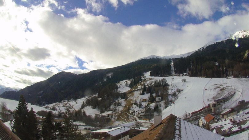 Blick von St. Valentin auf der Haide auf die Skipiste Haideralm mit ihrem Lift, Teil des Ski-, Bike- & Wanderresort Schöneben-Haideralm am Reschenpass. Auf der linken Seite kann man den Haidersee erkennen, den zweitgrößten natürlichen See der autonomen Provinz Bozen. Sehen Sie sich diese Webcam an, um die Wetter- und Schneebedingungen in St. Valentin auf der Haide in der Nähe des Reschenpass, an Italiens Grenze zu Österreich und der Schweiz, zu entdecken.