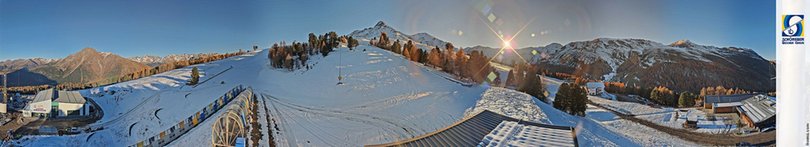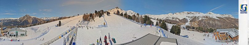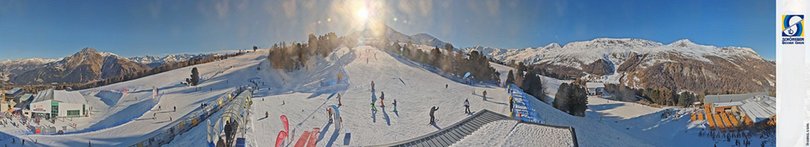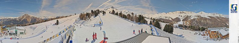 Panoramablick auf die Bergstation von Schöneben, im Ski- Wander- und Fahrradgebiet Schöneben - Haideralm am Reschenpass. Im Winter zeigt die Webcam die Skischule für die Kinder. Das Skigebiet bietet 65 km Pisten und 11 Aufstiegsanlagen, die Sie bis auf 2.350m bringen, das ideale Ziel für Ski- und Snowboardliebhaber und Familien! Im Sommer ist das Gebiet ein Paradies für Ausflüge zu Fuß und mit dem Mountainbike, mit 200 km Wanderwegen und 50 km MTB trails, die eine unvergessliche Erfahrung garantieren.
