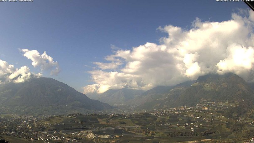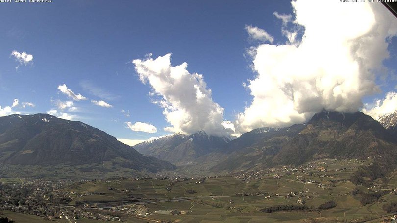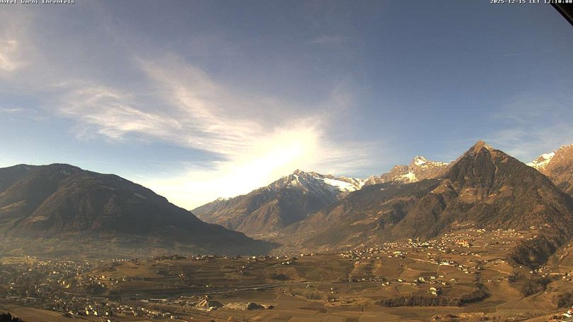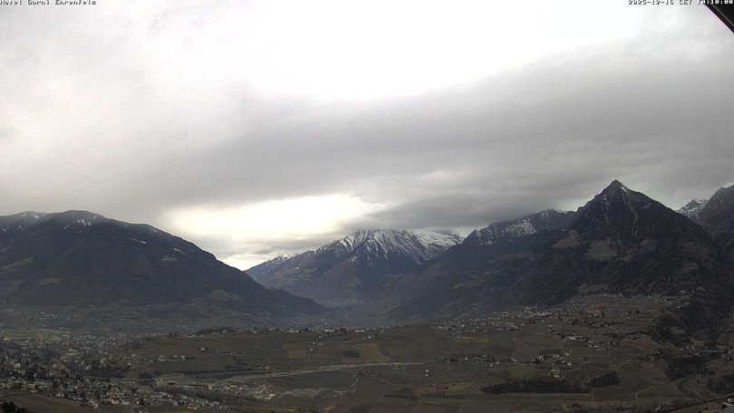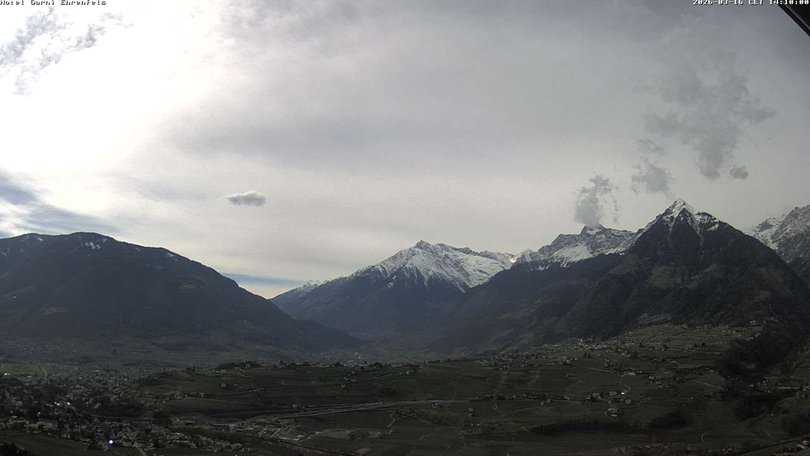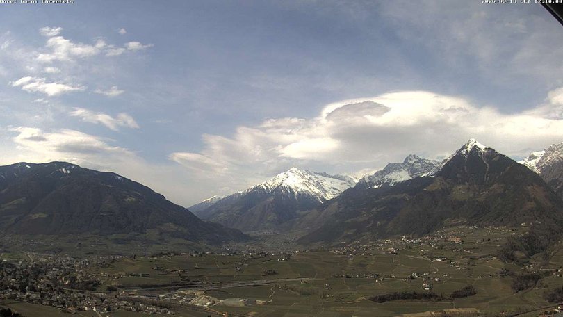 Panoramablick auf die Stadt Meran, die Dörfer Tirol, Marling und Lana und die umliegenden Berge: Mutspitze, Zielspitze, Texelgruppe. Das Gebiet ist ein beliebtes Urlaubsziel zu jeder Jahreszeit, dank des milden Klimas, der Thermalbäder und der Skipisten von Schenna und der nördlicheren Orte. Mit dieser Webcam wissen Sie immer, wie das Wetter in Meran ist und wann der erste Schnee fällt!