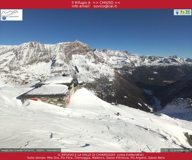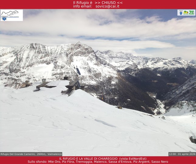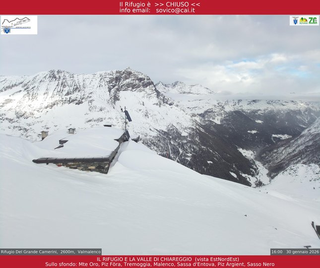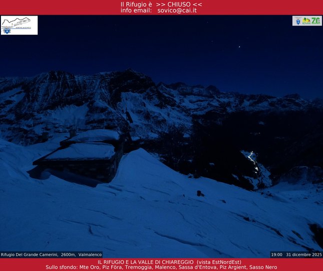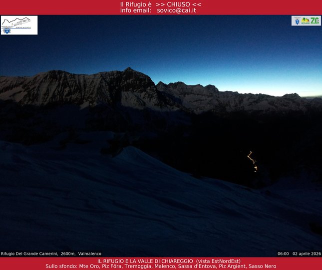 Die Webcam ist etwas weiter im Berg als die Berghütte Del Grande – Camerini und ermöglicht es, den Ausblick in Richtung Osten zu genießen. Auf der rechten Seite kann man einen Teil des Malencotals, auch Valmalenco genannt, sowie den gewundenen Verlauf des Mallero-Bachs sehen.