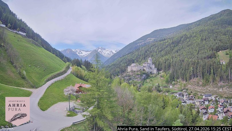 Diese Webcam bietet einen schönen Blick auf die Burg Taufers und das darunter liegende Dorf Sand in Taufers. Die Burg, die auch besichtigt werden kann, dominiert das Tauferer Tal im Süden und bewacht den Eingang zum Ahrntal im Norden. Im Hintergrund des Bildes sind die Berge Wolfskofel, Vordere Hornspitze, Schönberg, die Hornspitzen Eins, Zwei und Drei, Schwarzenstein sowie die westliche Floitenspitze am Hauptkamm der Ahrntaler Alpen zu sehen. Nutzen Sie die Webcam, um die Wetterbedingungen in diesem Gebiet Südtirols in der Nähe des Skigebiets Skiworld Ahrntal zu überprüfen.