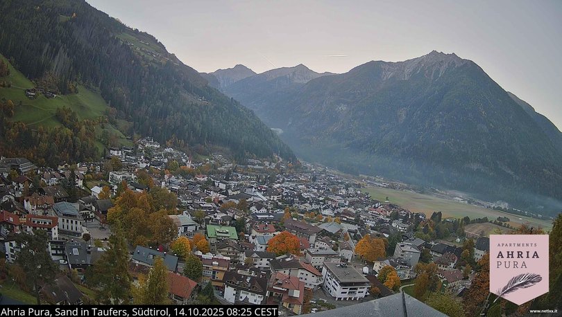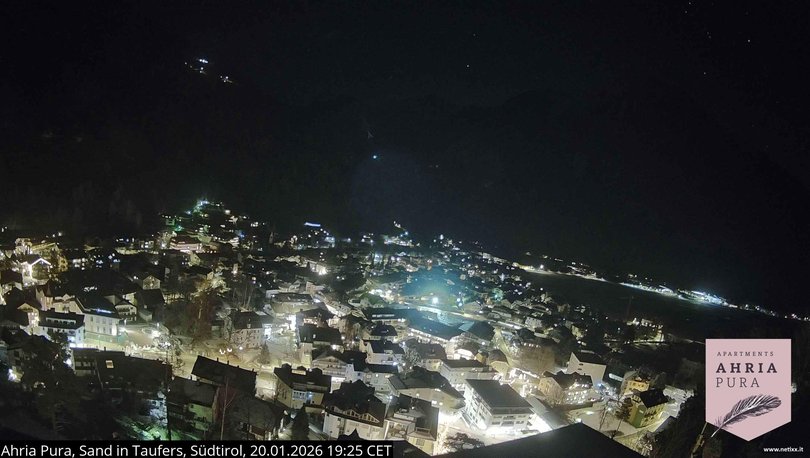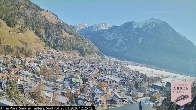 Die Webcam zeigt den Ausblick in Richtung Bruneck von den Ferienwohnungen AhriaPura in Sand in Taufers. Von links nach rechts dominieren die Gipfel Gatternock, Achternock, Wasserfallspitz und Blossberg das Tauferer Tal. In diesem Tourismusgebiet gibt es viele Möglichkeiten für Outdoor-Aktivitäten: vom Wandern im Naturpark Rieserferner-Ahr bis zum Bergsteigen, vom Mountainbiken bis zum Skifahren im Skigebiet Speikboden, Kanufahren, Paragliding, Drachenfliegen, Fischen und vielem mehr. Nutzen Sie diese Webcam, um zu erfahren, wie das Wetter in Südtirol im Gebiet des Ahrntals und des Tures-Tals ist.