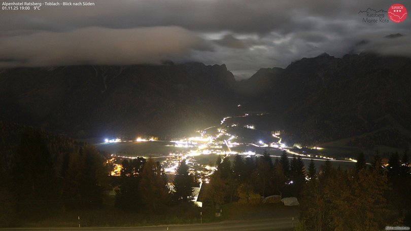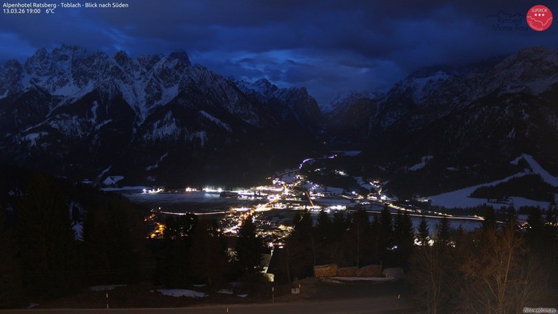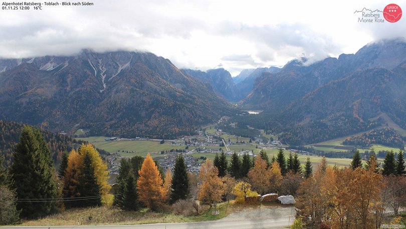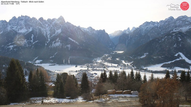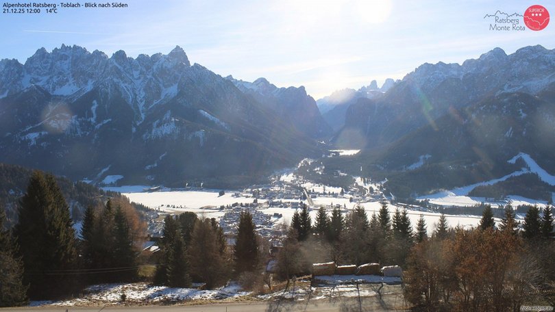 Blick vom Alpenhotel Ratsberg in Ratsberg in Richtung Höhlensteintal, mit dem Dorf Toblach und seinem See. Im Hintergrund des Panoramas die Dolomiten: vom Gsellknoten bis zum Haunold auf der linken Seite, dem Antelao in der Mitte und von Piz Popena, Monte Cristallo und Hoher Gaisl bis zum Rosskopf auf der rechten Seite. Diese Webcam ist ein idealer Aussichtspunkt, um die Wetter- und Schneebedingungen im Gebiet von Toblach, Hochpustertal, zu entdecken!
