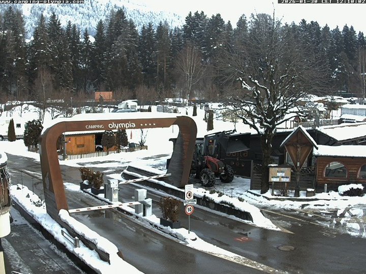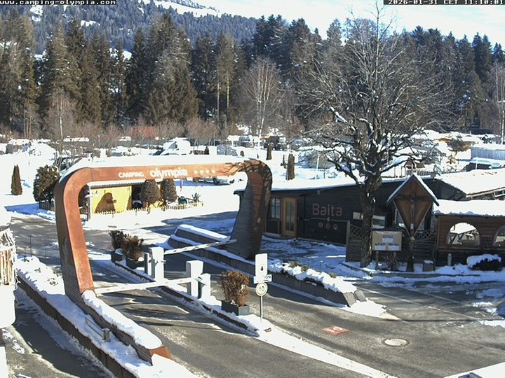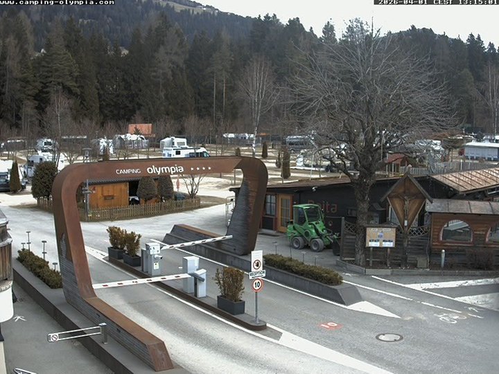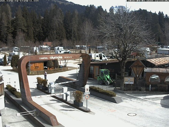 Blick auf den Eingang des Camping Olympia in Toblach, im Hochpustertal. Das ganze Jahr geöffnet, bietet der Campingplatz 200 Stellplätze und kleinere Plätze für Zelte. Wie ist das Wetter in Toblach? Diese Webcam ist perfekt, um dies zu jeder Zeit zu erfahren!