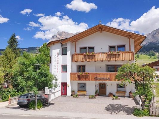 Spending your holidays in an apartment it makes possible to enjoy a break from everyday life, without, however, renouncing daily routines and habits, completely free. The apartments have various sizes and dispose of various bedrooms, satellite TV, WLAN, bathroom/shower, toilet, bidet, safe, kitchen unit with dishwasher as well as spacious balconies with mountain view to Heiligkreuzkofel, La Varella and Conturines on one side, and Gardenaccia and Sassongher on the other side. The upper floors are accessible by elevator and we dispose of a ski shoe warmer, a bike deposit, a charging station for electric vehicles, a washing machine and a private car parking, too.