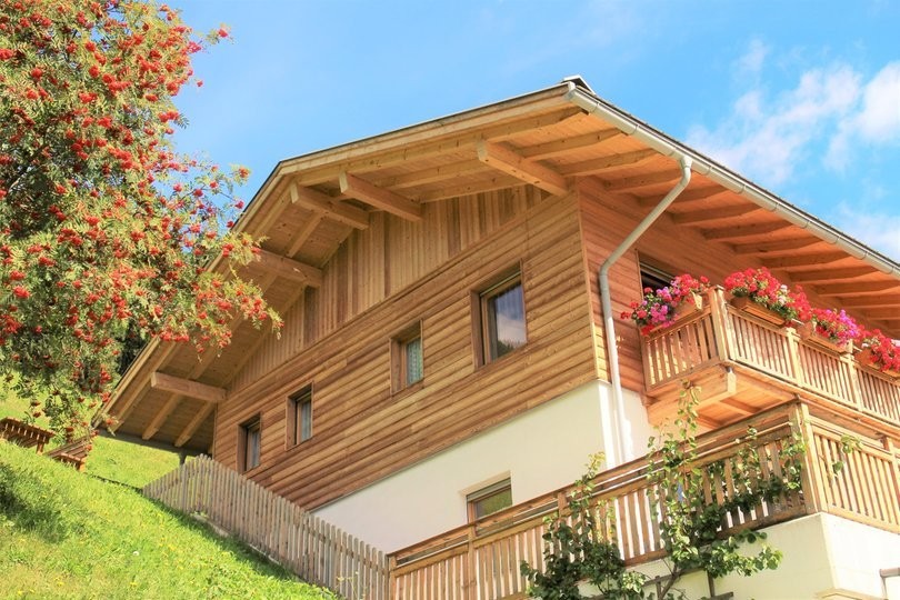 Our apartments (40m2) in the main building have been lovingly furnished in a modern style. Each apartment has a south-facing balcony overlooking San Candido and the magnificent scenery of the Dolomites. Each apartment consists of a kitchen/living room (satellite TV & WiFi), a bedroom (double bed) in a traditional pine look, a separate level with two additional beds, and a bathroom (hair dryer).