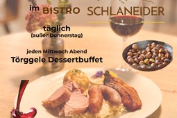 Törggelen at the Schlaneiderhof Bistro every day, except Thursday Every Wednesday evening Törggele dessert buffet For reservations call +39 0471668147