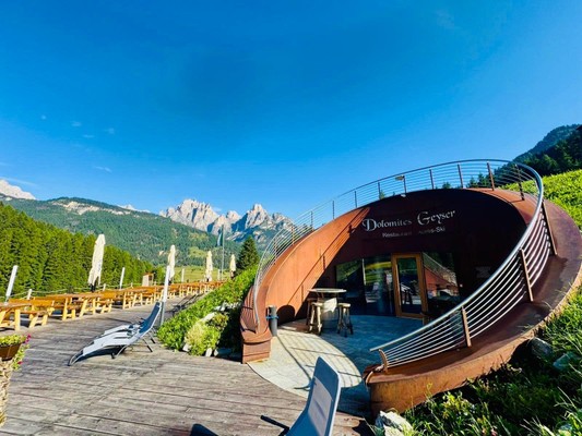 Dolomites Geyser Restaurant Après Ski is far from an ordinary mountain restaurant. Entirely built underground, it blends seamlessly into the landscape and reveals a surprising interior: modern, warm and filled with light, designed to welcome guests in every season.