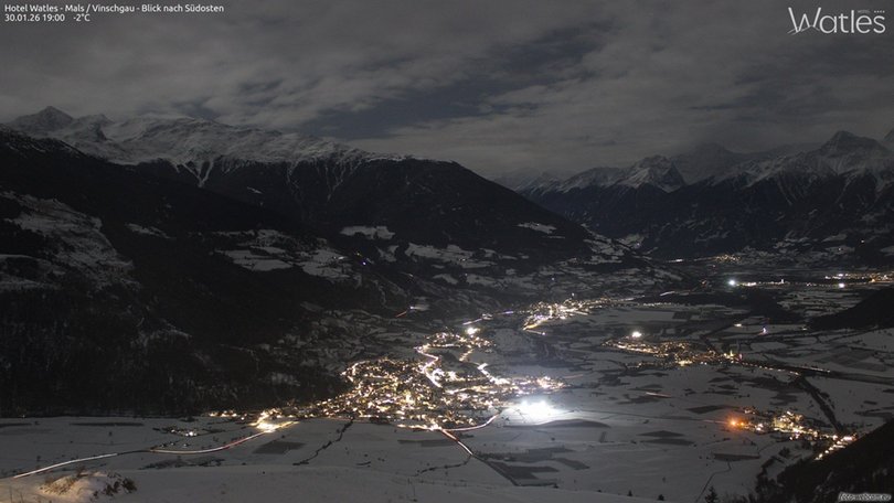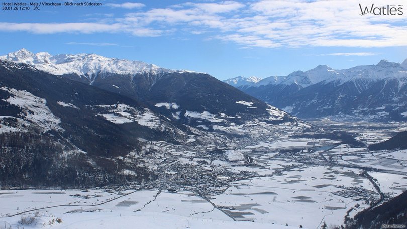 The webcam is located in Malles / Mals, on the roof of the Panoramahotel Watles. It faces south-east towards the Venosta / Vinschgauer Valley and the Ortler mountain range. The Venosta / Vinschgau Valley in South Tyrol / Südtirol is an ideal destination for skiing, mountain biking, motorcycle tours and much more.