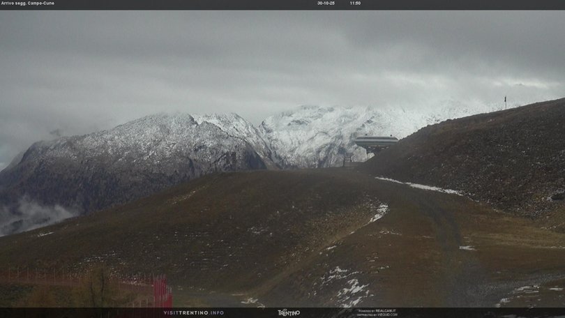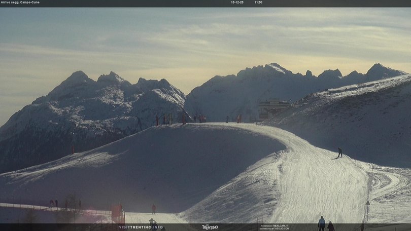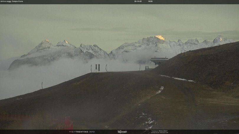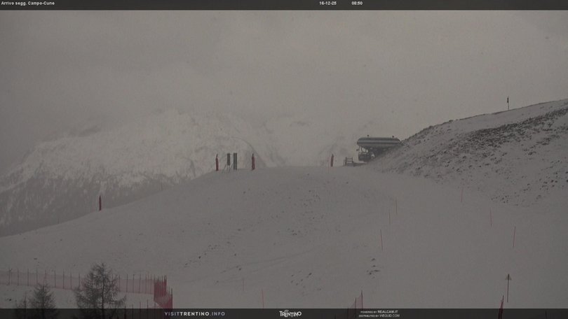 The webcam shows the top station of the Campo-Le Cune chairlift, within the Alpe Lusia Ski Area. The facility connects the towns of Campo di Bellamonte and Le Cune, at 2213 meters above sea level. The chairlift serves the black ski slope Direttissima and the Le Cune ski slope. In the background you can see part of the Lagorai mountain chain / Lagorai-Bergkette. Consult this webcam to discover the weather and snow conditions in this famous ski and hiking resort area in Trentino.