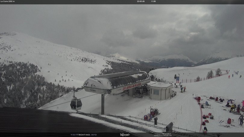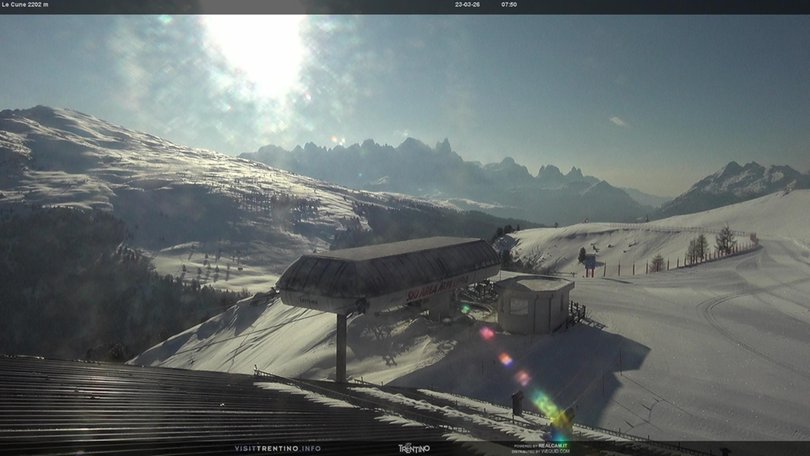 The webcam is located at the Le Cune panoramic viewpoint, in the Alpe Lusia ski area, on the border with the Paneveggio Natural Park. In the foreground, the mountain station of the Valbona-Le Cune cable car. The lift serves the slopes "Direttissima Le Cune" and "Cune-Campo", which connects the Alpe Lusia with Bellamonte. In the background you can see the peaks of the Pale di San Martino / Pallagruppe and the Lagorai chain / Lagorai-Bergkette. This webcam allows you to check at any time the weather and snow conditions in this area of Trentino / Trient near the Paneveggio Natural Park.