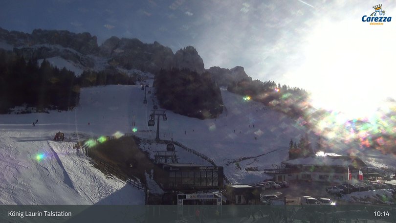 This webcam shows the valley station of the King Laurin / König Laurin cable car in the Carezza ski area. Only the initial and final sections of the track are visible from the outside, the rest of the route runs underground. It is a futuristic project by the architect Werner Tscholl, who wanted to preserve the wonderful territory and its landscape at the foot of the Dolomites in the best possible way. The webcam allows you to follow the live weather and snow conditions at this ski resort in Nova Levante / Welschnofen, South Tyrol / Südtirol.