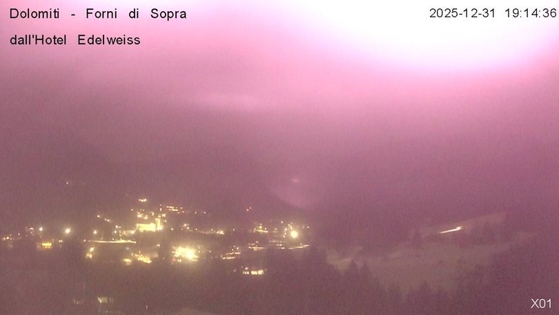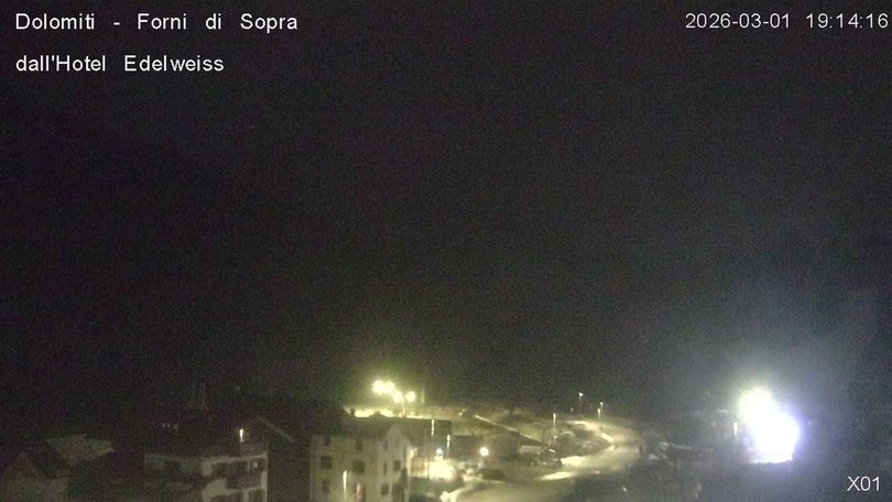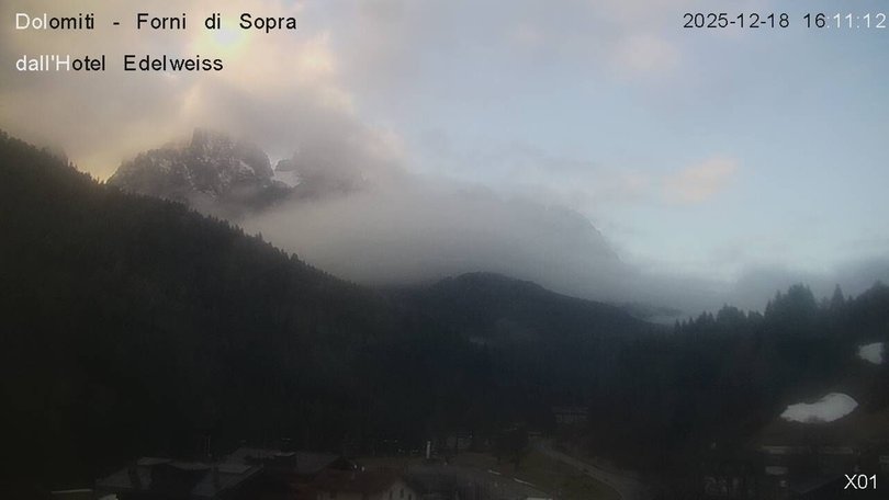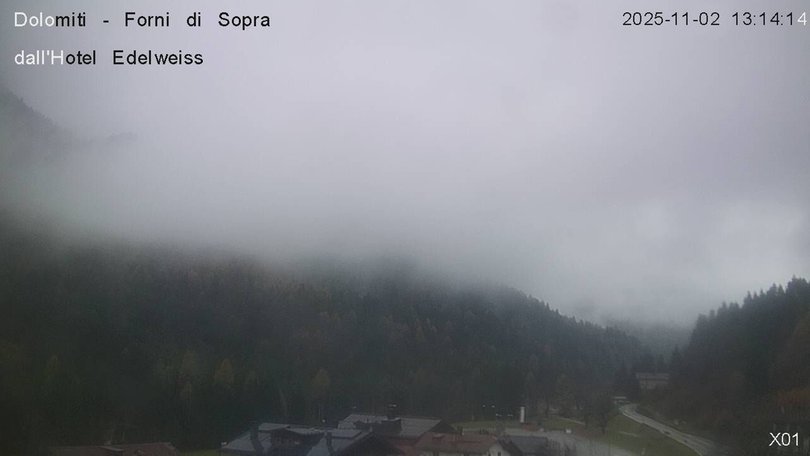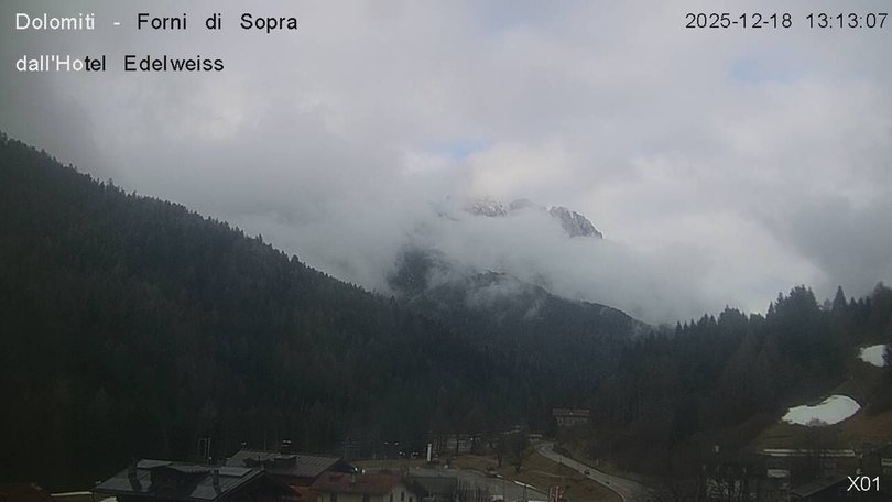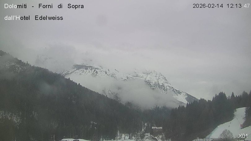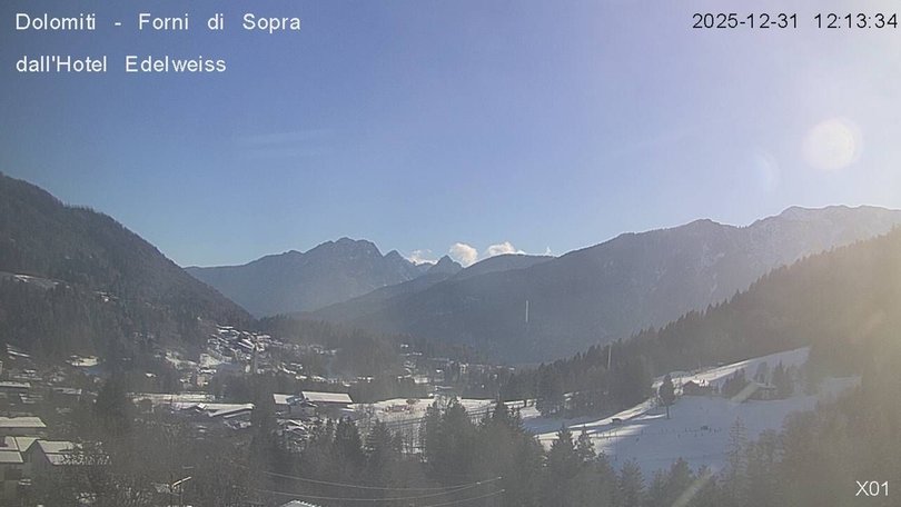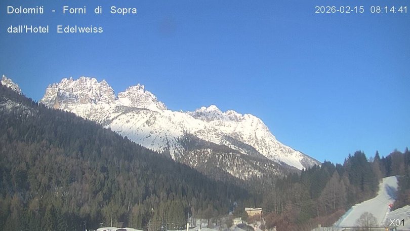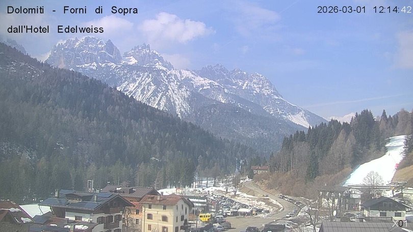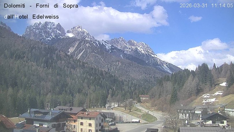 Panoramic view on the Friulian Dolomites from the Hotel Edelweiss in Forni di Sopra. From this webcam you can see the Gruppo del Cridola with the Scodavacca saddle. An ideal observation point to control the weather conditions and the winter snowfalls, which cover the ski slopes in white.