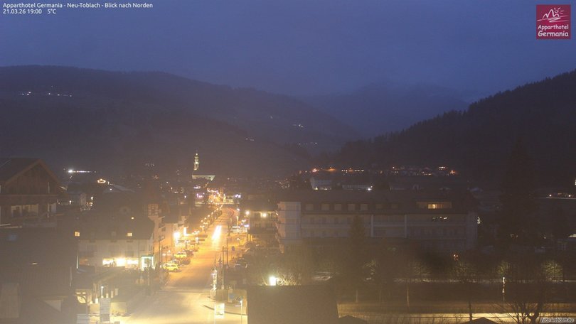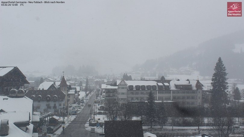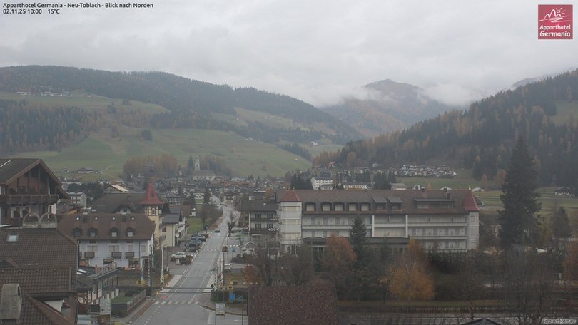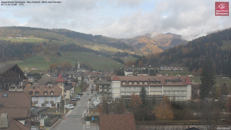 View on the village Dobbiaco / Toblach in Alta Pusteria. In the distance, northbound, the Parish Church of St. John the Baptist, then the gaze stretches out in the direction of Valle San Silvestro and the Monte Rota / Radsberg (Alpi Pusteresi / Deferegger Alpen). The webcam is installed on the Apparthotel Germania and allows you to know in real time the weather conditions of Dobbiaco / Toblach.