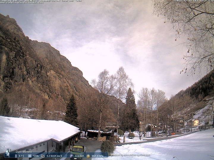 This webcam is part of the meteorological station at the Camping ground Val di Rhêmes. Besides the images, this webcam also transmits information about temperature, humidity, wind, rain and atmospheric pressure. The webcam points north and offers a partial view over the Val di Rhêmes. During winter, behind the trees, one can see the houses of the village Rhêmes-Saint-Georges, surrounded by beautiful nature. The municipality is crossed by the river Dora di Rhêmes which, on its orographic right side, is part of the National Park Gran Paradiso.