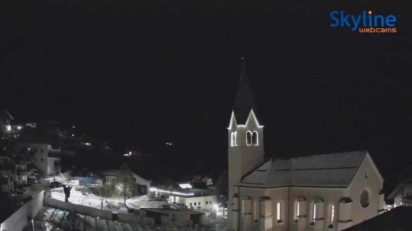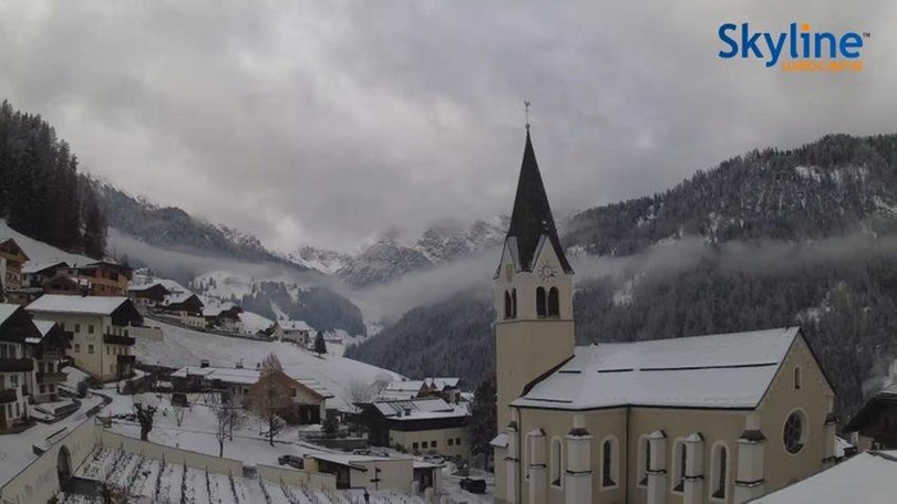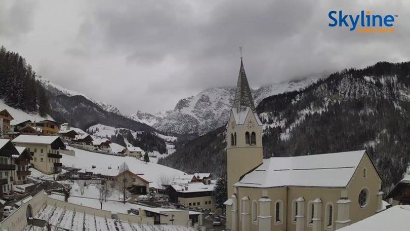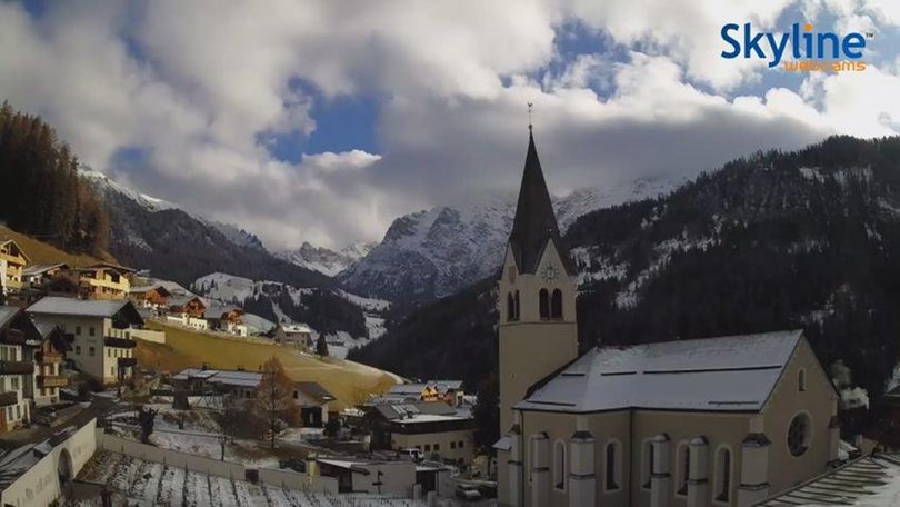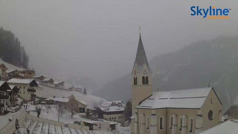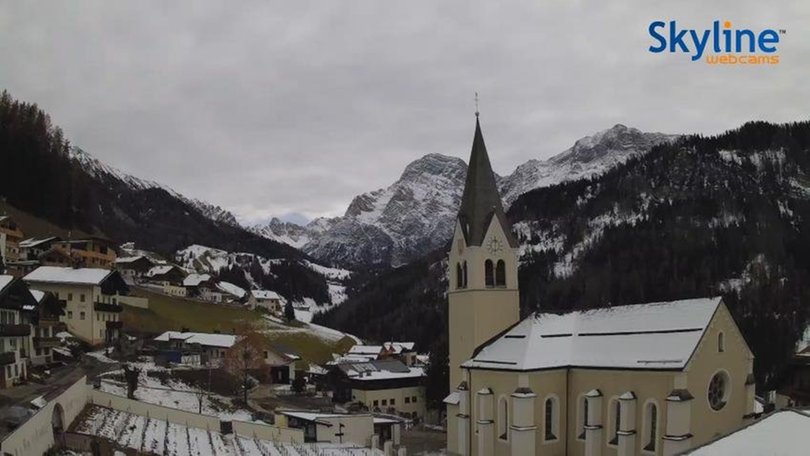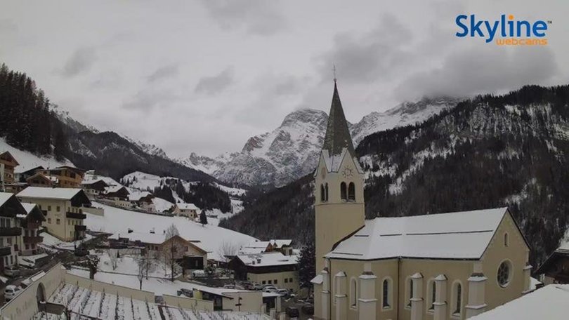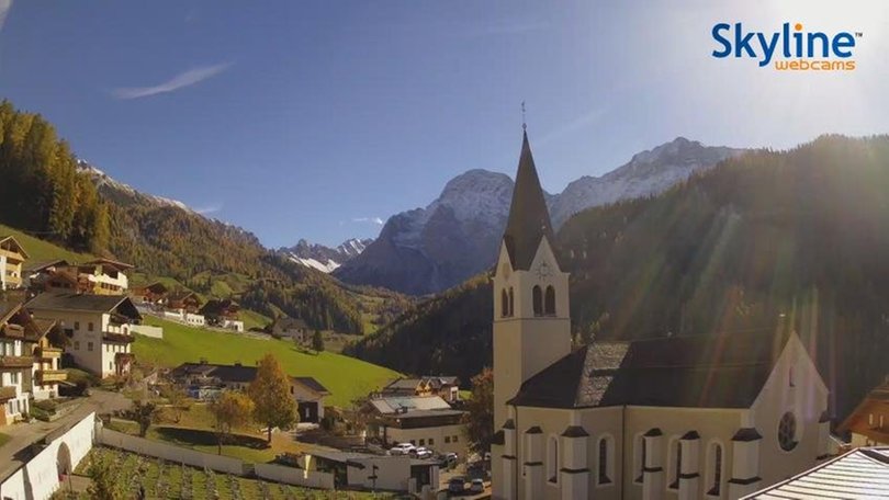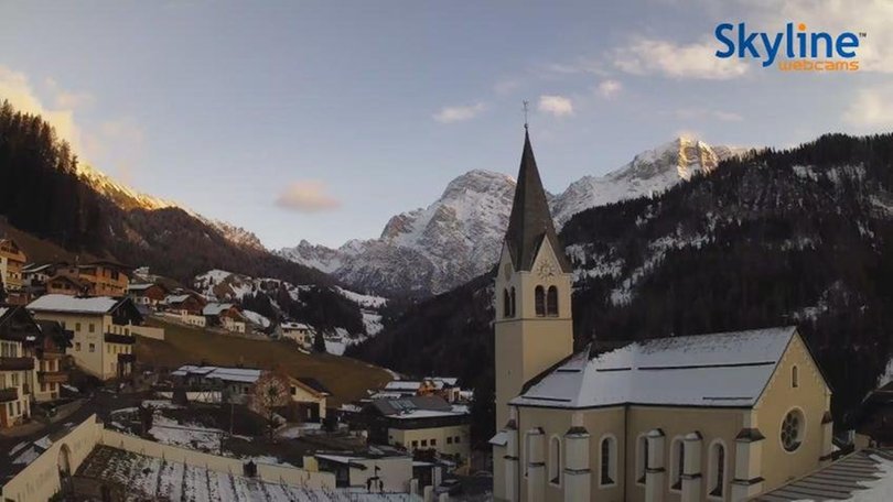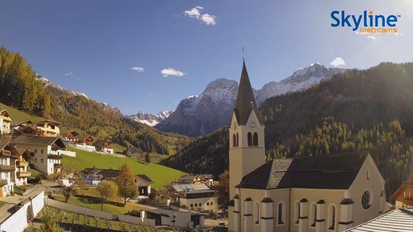The webcam is installed on the roof of the Hotel Pider and offers a beautiful view shot of the parish church of La Valle. The neo-Romanesque Church of San Genesio was built in 1874 and boasts a bell tower 42 meters high. In the background the Cima Nove and the Cima Dieci which is the highest peak of the long ridge of the Sasso di Santa Croce that dominates the Val Badia / Hochabtei. The webcam is an excellent vantage point to see the weather conditions in this part of Alta Badia / Hochabtei, at the foot of the Dolomites of South Tyrol / Südtirol.