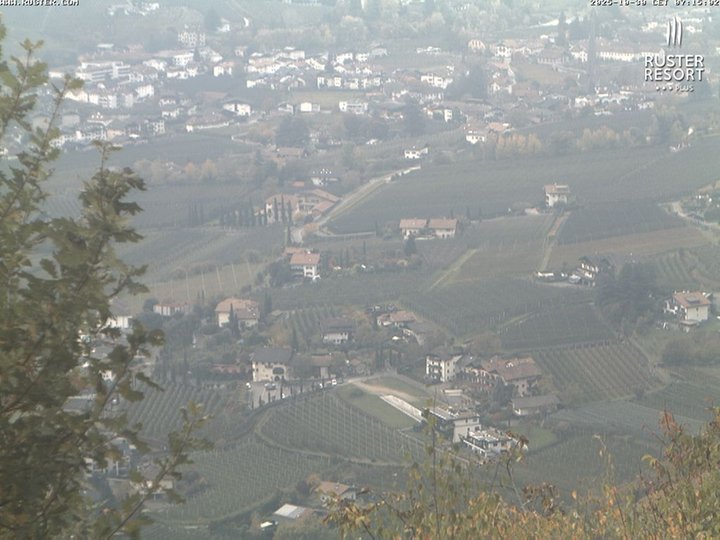 Wacht Lagundo and its vineyards directly from Tirolo. In the lower part of the image you will see the Ruster Resort, behind it Mühlbach and Foresta...live!