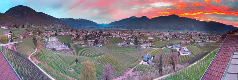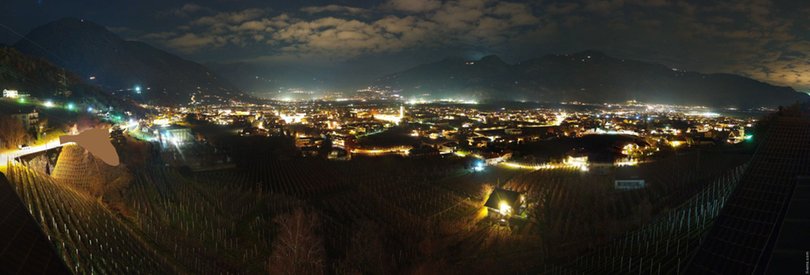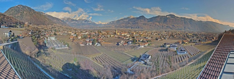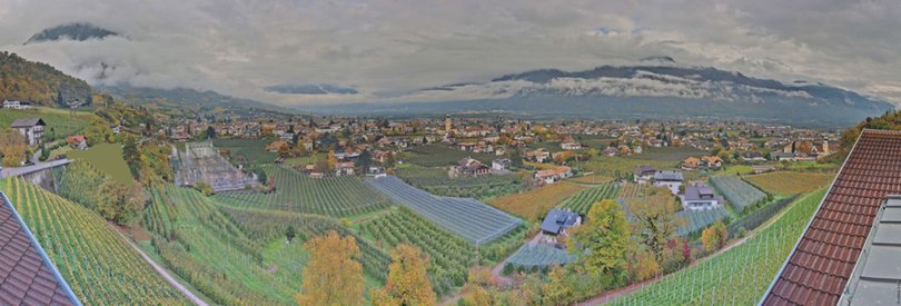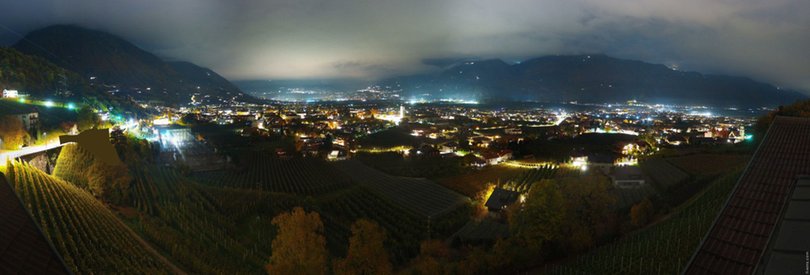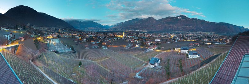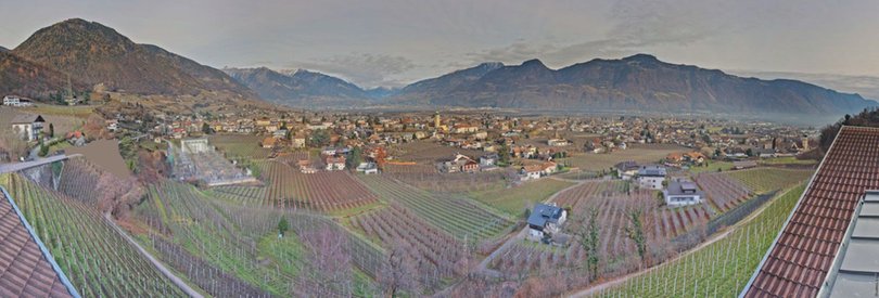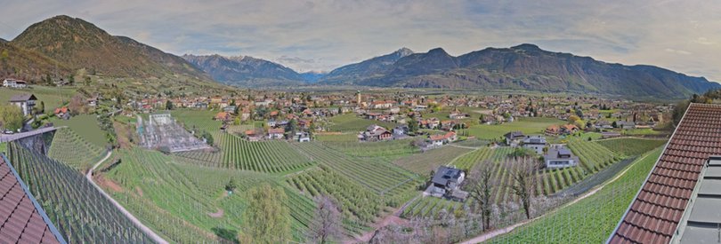 The webcam, installed on the roof of the Panorama Hotel Garni Bühlerhof in Lana, faces the valley and allows you to see in the background the Sarntal Alps / Sarntaler Alpen with the Ifinger Peak / Ifinger-Gipfel, Monte Muta / Mutspitze and Punta Cervina / Hirzer. At the foot of the hotel, you can see the picturesque Brandis Roggia Path / Brandiser Waalweg, which leads through forests, vineyards and orchards, overlooking the village of Lana. Further on are the villages of Cermes / Tscherms and Verano / Vöran. At the foot of the mountains is the area of Merano with the villages of Tyrol / Tirol and Scena / Schenna. Check out this webcam to find out in real time the weather conditions in this area of South Tyrol / Südtirol south of Merano / Meran.