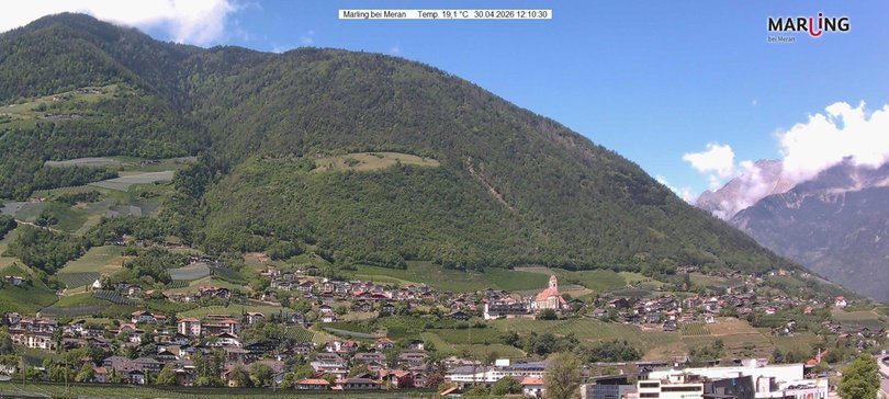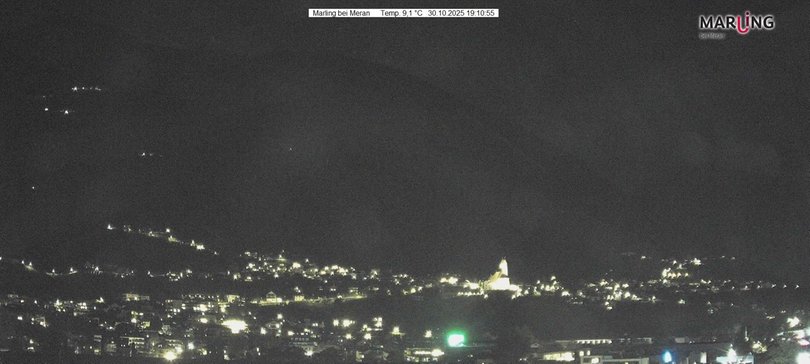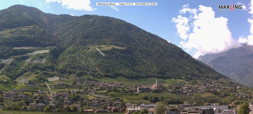 The webcam is located at the Marlengo / Marling sports center. It offers a glimpse of the village with the bell tower of the Parish Church and the Mountain of Marlengo / Merling. On the right you can see part of the Texel Mountain Group, in the in the Texel Group Nature Park. This webcam is oriented towards the east, and is ideal for admiring the sunrise and for checking the weather and snow conditions at any time in this charming town in South Tyrol / Südtirol.