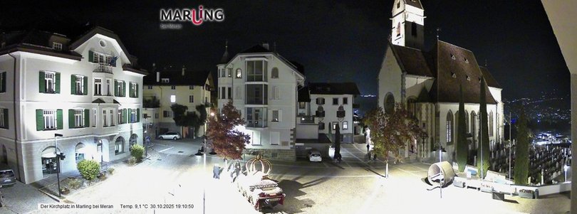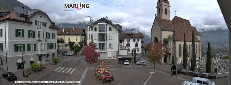 A glimpse of the church square in Marlengo / Marling, near Merano. The Parish Church Maria Himmelfahrt was consecrated in its current form in 1901 and boasts a church bell called Annamaria, dating back to 1847 and weighing 3.163 kg. On the right of the church, you may spot the mountain Ifinger (2.581 m a.s.l.) at the foot of which the ski area Merano 2000 is located. This webcam, installed at the Tourist office Marlengo / Marling, is perfect to discover the weather conditions of Marlengo / Marling, southwest of Merano.