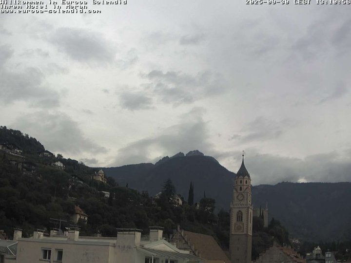 The webcam is pointed towards the old town of Merano / Meran. In the foreground the Church of San Nicolò, the city cathedral with one of the highest bell towers in South Tyrol / Südtirol. To the right of the bell tower is the Powder Tower, a medieval fortification used in ancient times as a gunpowder depot. Beyond the Tower is the panoramic Tappeiner Promenade / Promenade Tappeinerweg, considered among one of the most beautiful in Europe. In the background, the peaks of the Merano 2000 ski and hiking area. The webcam, located at the Boutique & Design Hotel ImperialArt, allows you to see the weather conditions in the spa town of Merano / Meran at any time.