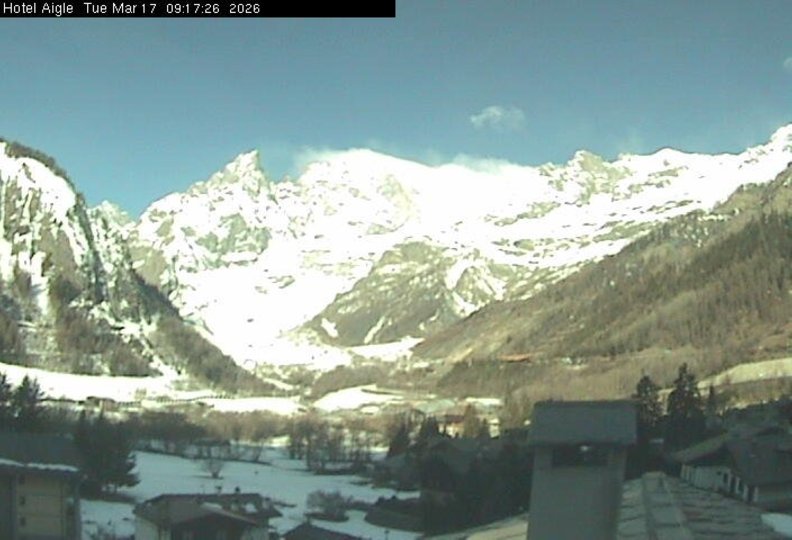 Panoramic view from Courmayeur towards the Mont Blanc, with its 4.810 m the highest mountain of the Alps. With the Skyway Monte Bianco cable car it is possible to nearly reach its peak and it will make you feel like touching the sky. Also thanks to this webcam, installed on the roof of a hotel in Courmayeur, the weather and snow conditions are always only a click away.