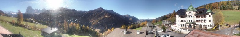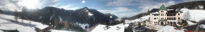 The webcam is located on the roof of Hotel Ansitz Jakoberhof's annex. The picture shows the characteristic architecture of the hotel’s main building, situated in the hamlet of San Giacomo / St. Jakob (Ortisei / St. Ulrich) in Val Gardena / Gröden. The village of San Giacomo / St. Jakob, at the foot of Monte Pic, is a sunny oasis of peace, only 2 kilometres from the village of Ortisei / St. Ulrich. To the left of the hotel, one sees the Corno del Renon, further left the summits behind which the Alpe di Siusi stands out, followed by the Sassopiatto, the Sassolungo and finally the Sella Group.