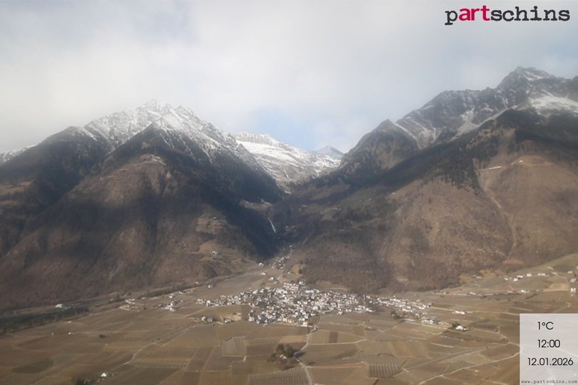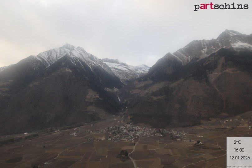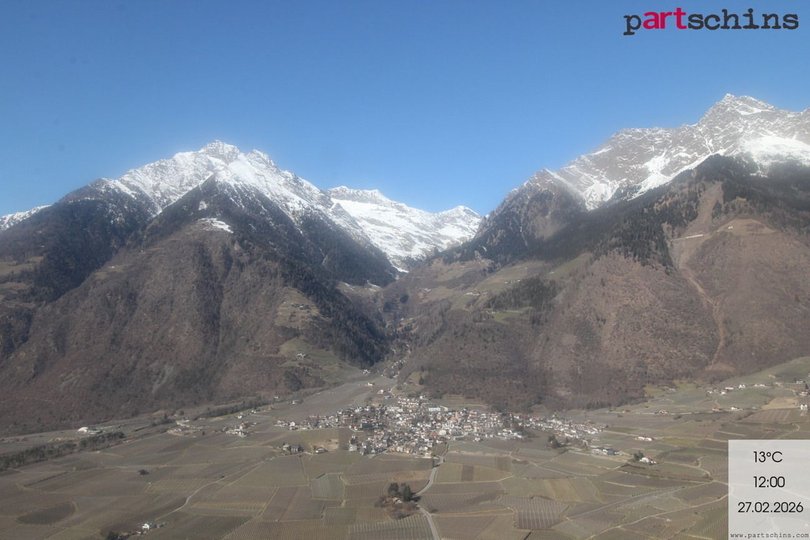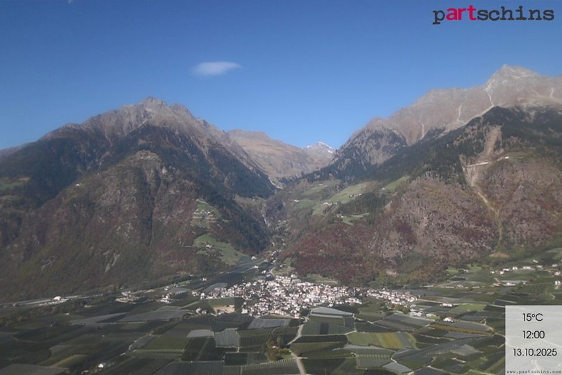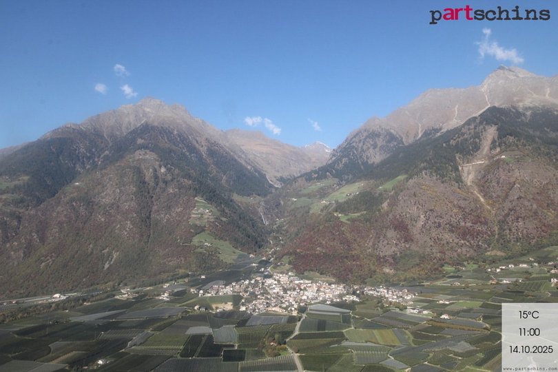 Panorama on the village Parcines / Partschins, northwest of Merano. The mountains of the Gruppo di Tessa Nature Park, which are part of the Ötztal Alps in the Central Eastern Alps, stand out on the background, with the highest peak, the Monte Rosso, reaching an altitude of 3.337 m a.s.l. A part of the Nature Park can be discovered following the famous Alta Via di Merano. Take a look at this webcam to get to know the weather conditions in this area between Merano and the Val Senales.