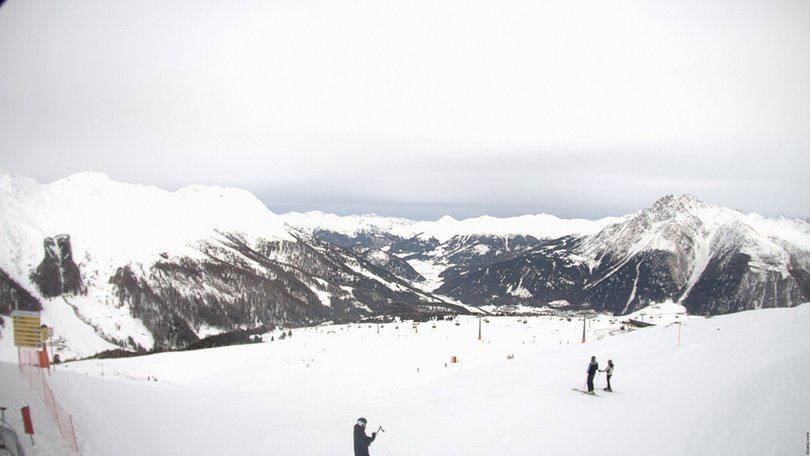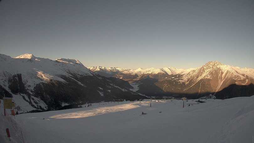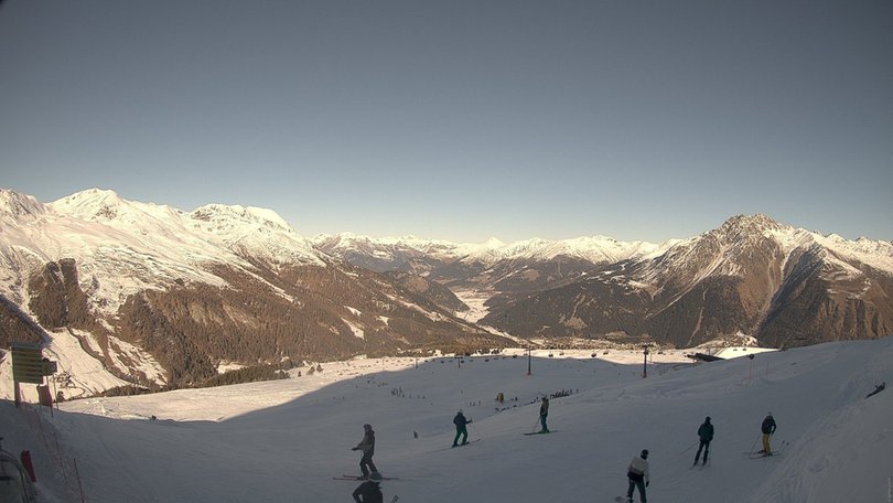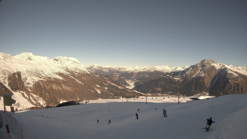 Panorama from the mountain station of the chair lift Rojen in the skiing, mountain biking and hiking resort Belpiano-Malga di San Valentino on Passo di Resia. The webcam offers a wide view of the ski slopes of this ski area in the foreground, while in the background stand out the village of Resia / Reschen and the peak Klopaierspitze (2.914m a.s.l.). On the left lies the Reschen Pass that leads to the border between Italy and Austria. This live cam is the perfect observation point to discover the weather and snow conditions in the area of the Reschen Pass in Val Venosta / Vinschgau.