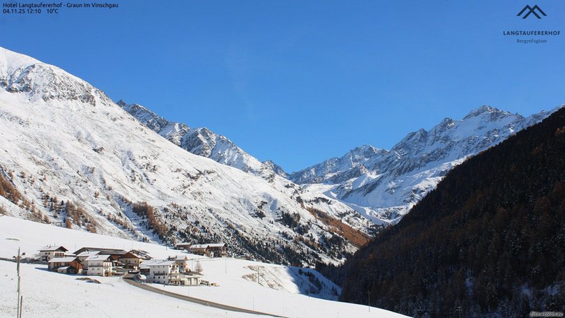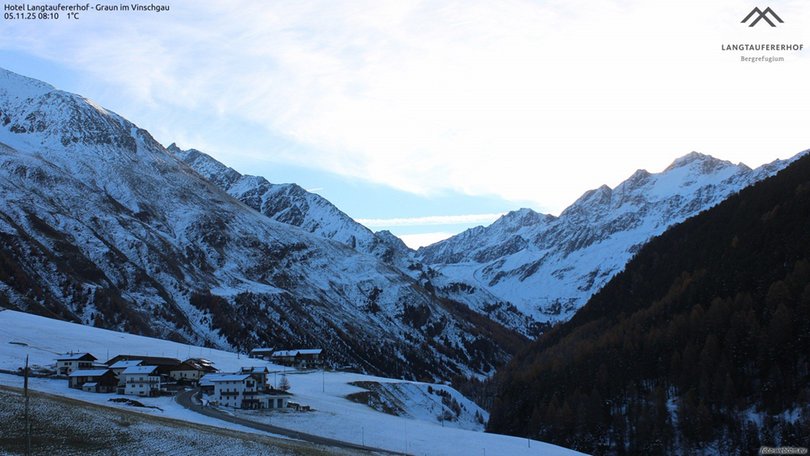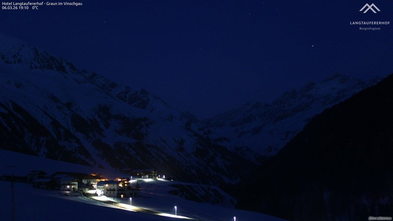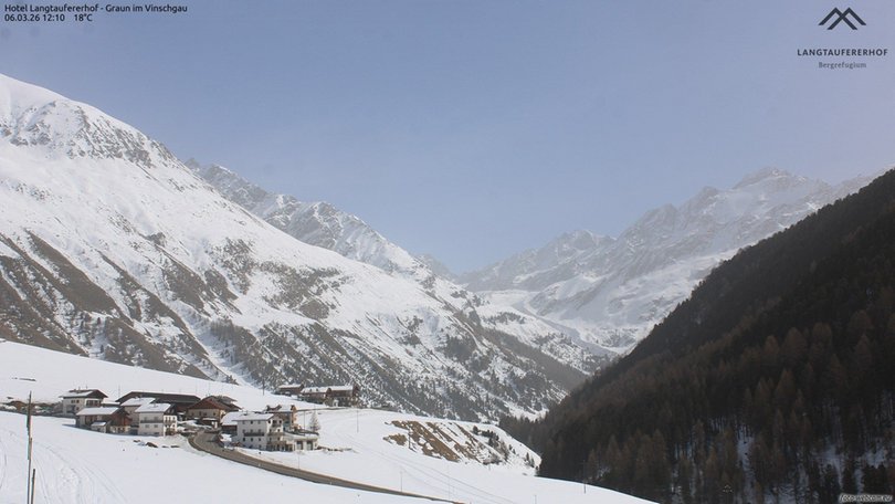 Panoramic view from Cappella, Curon, towards the Vallelunga, a valley that extends from Curon to Melago. The valley is a popular destination for fans of mountain bikes, trekking and hiking in summer as well as skiing, snowboarding, ski mountaineering and cross-country skiing in winter. From the hotel, that owns the webcam, the 3.000 m peaks of the Ötztal Alps are only a stone’s throw away: Weißkugel, Weißenseespitze, Nauderer Hennesiglspitze, etc. Thanks to this webcam you can always control weather and snow conditions of the Vallelunga right here!